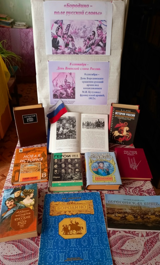 В Новоюрьевской сельской библиотеке к этой памятной дате организована книжная выставка «Бородино – поле русской славы». На выставке представлены книги, рассказывающие об истории этого сражения: когда оно проходило, между войсками каких стран и чем закончилось. Выставка будет интересна всем, кто увлекается изучением истории России.