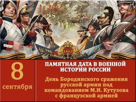 8 сентября отмечается День воинской славы России – День Бородинского сражения русской армии под командованием М.И. Кутузова с французской армией. Бородинская битва – важнейшая битва Отечественной войны 1812 года.