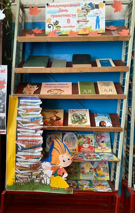 Ко Дню грамотности в библиотеке оформлена книжная выставка «Международный День грамотности», которая состоит из информационно-справочной литературы: толковых, орфографических и других словарей, справочников и детских книг для развития речи.