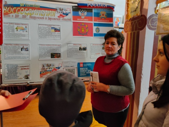 В рамках этой памятной даты работники культуры с. Староалександровка провели инфо-сообщение «Одна страна, одна семья, одна Россия!» у выставки «День воссоединения России и ДНР, ЛНР, Запорожской и Херсонской областей».