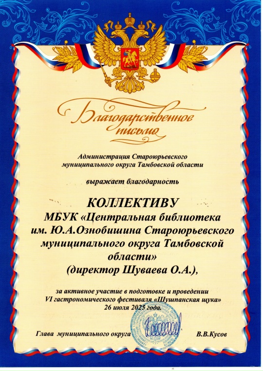 29 сентября в Центре досуговой деятельности села Староюрьево царила атмосфера праздника, посвященного Дню туризма. В этот день чествовали тех, кто внес свой вклад в развитие гастрономического туризма, награждая участников блистательного VI фестиваля «Шушпанская щука». Благодарностью удостоился коллектив МБУК ЦБ, которому было вручено Благодарственное письмо администрации округа за активное участие в подготовке и проведении этого яркого кулинарного события.