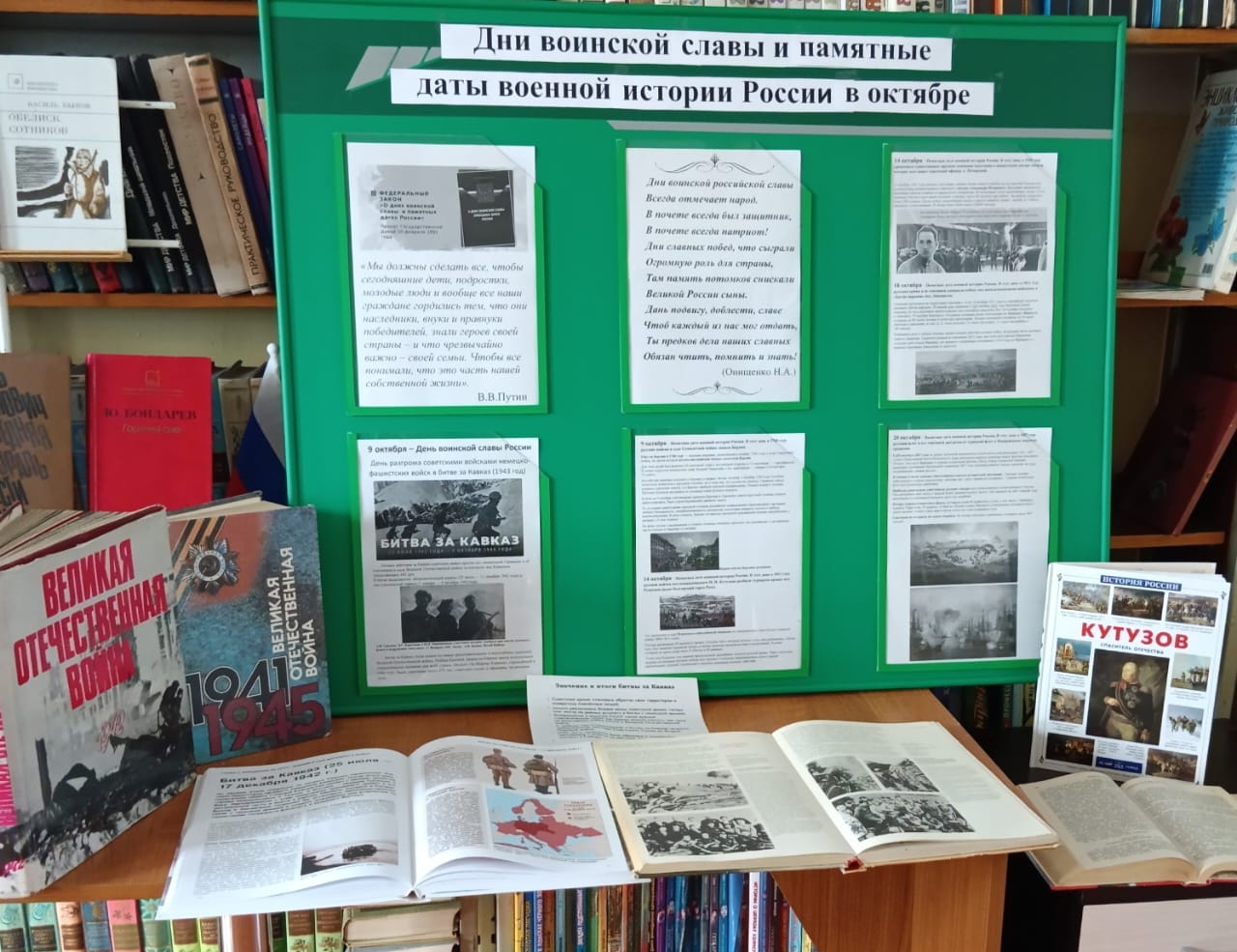 В МБУК «БКМО» был оформлен стенд «Дни воинской славы и памятные даты в октябре» и книжная выставка, посвященная битве за Кавказ. Посетители библиотеки с интересом знакомились с представленными материалами.
