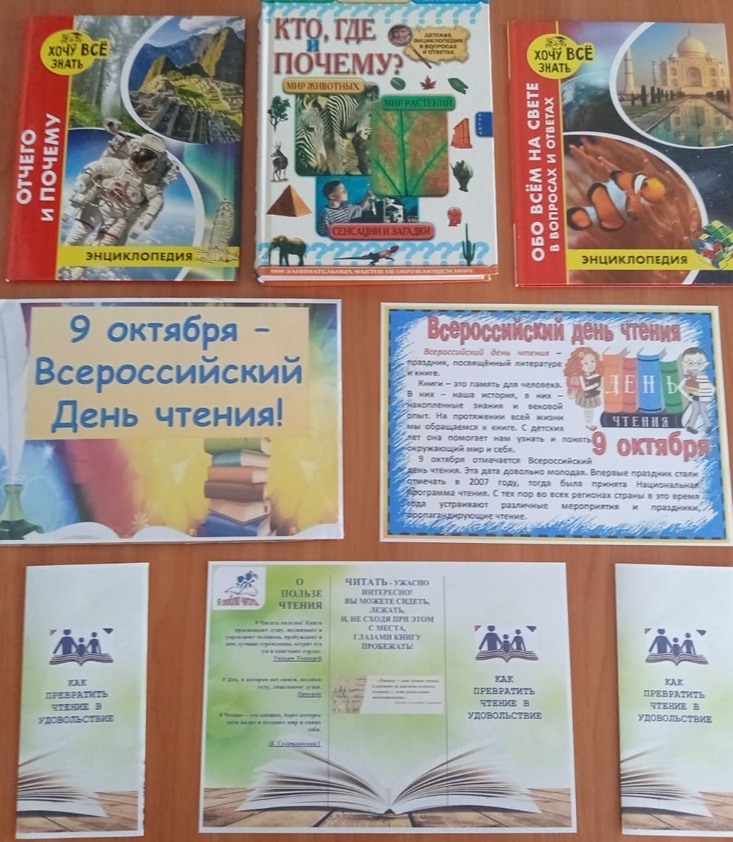9 октября отмечается Всероссийский день чтения. Этот замечательный праздник был учрежден в 2007 году с принятием Национальной программы чтения и посвящён литературе и книгам. Сотрудники МБУК «Межпоселенческая библиотека Тамбовского муниципального округа» провели беседу-размышление «Книга в моей жизни». С учениками Горельской СОШ порассуждали о пользе чтения, как чтение открывает нам новые горизонты и помогает познать мир и самого себя, и что книги должны быть неотъемлемой частью нашей жизни. К мероприятию были подготовлены информационные буклеты «Как превратить чтение в удовольствие» и пригласительные открытки в нашу библиотеку.