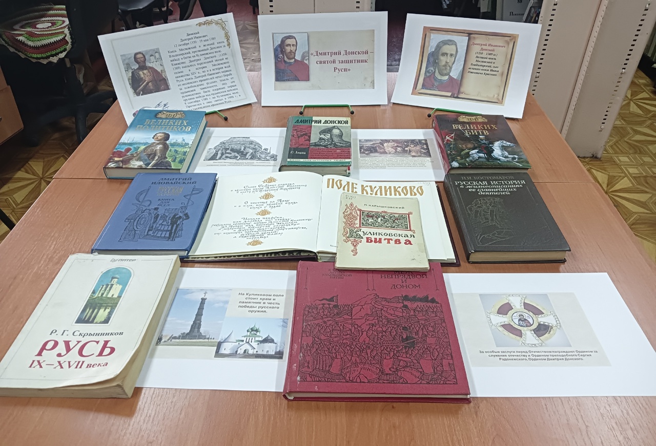 12 октября 2025 года исполняется 675 лет со дня рождения Дмитрия Донского – великого князя Московского и Владимирского, мудрого полководца, собирателя земель русских. К этой знаменательной дате в центральной библиотеке подготовлена книжная выставка «Дмитрий Донской- святой защитник Руси».