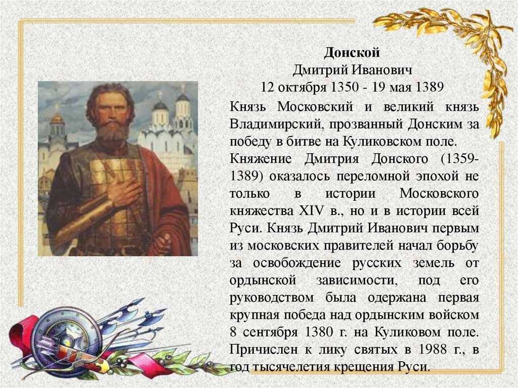Его имя свято для каждого русского человека. Его память чтит благодарная Россия. Его подвиг не будет забыт, пока стоит Русская Земля. А ведь, когда княжич Дмитрий, всего девяти лет от роду, унаследовал Московский стол, многим казалось, что Русь доживает последние дни – ордынское иго, княжеские усобицы и страшные эпидемии поставили русский народ на грань жизни и смерти. Судьба страны решилась в 1380 году на Куликовом поле, где князь Дмитрий Иванович сражался как простой ратник — в обычной броне, без охраны, в самой гуще рукопашной. В истории России эта победа стала первой вехой на пути к созданию централизованного русского государства.