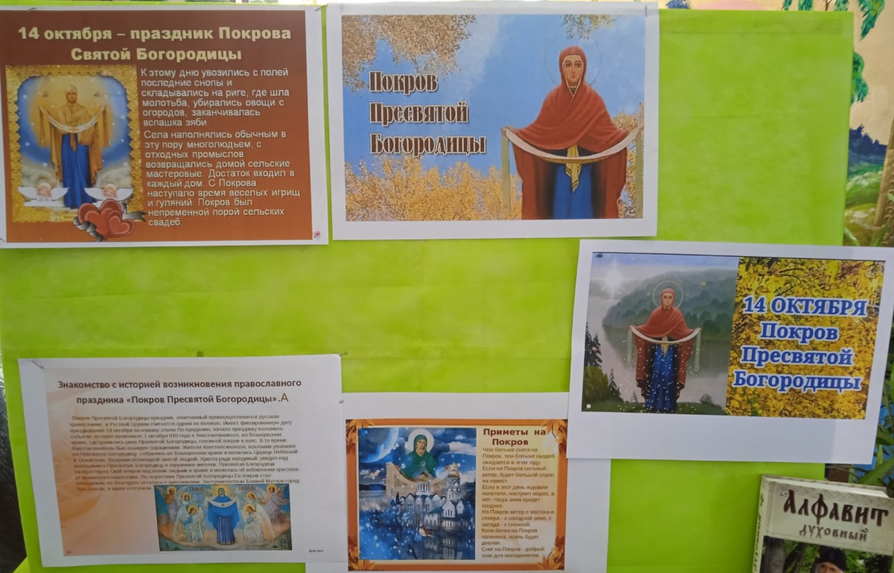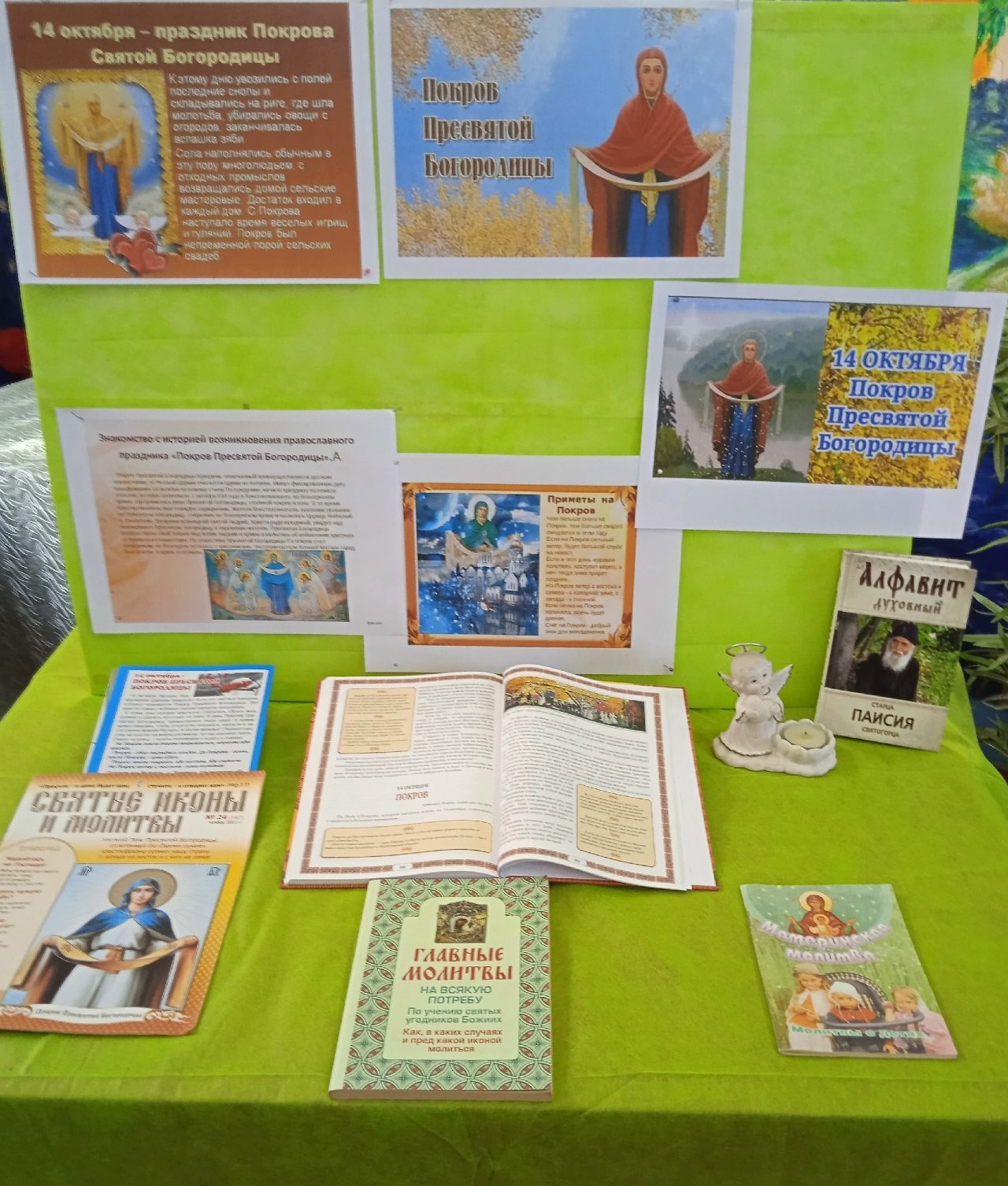 К этому дню в Садостроевском филиале подготовлена книжная выставка “Покров Пресвятой Богородицы” , на которой представлена духовная литература, информация об истории праздника, о поверьях на Покров и народных традициях этого праздника.