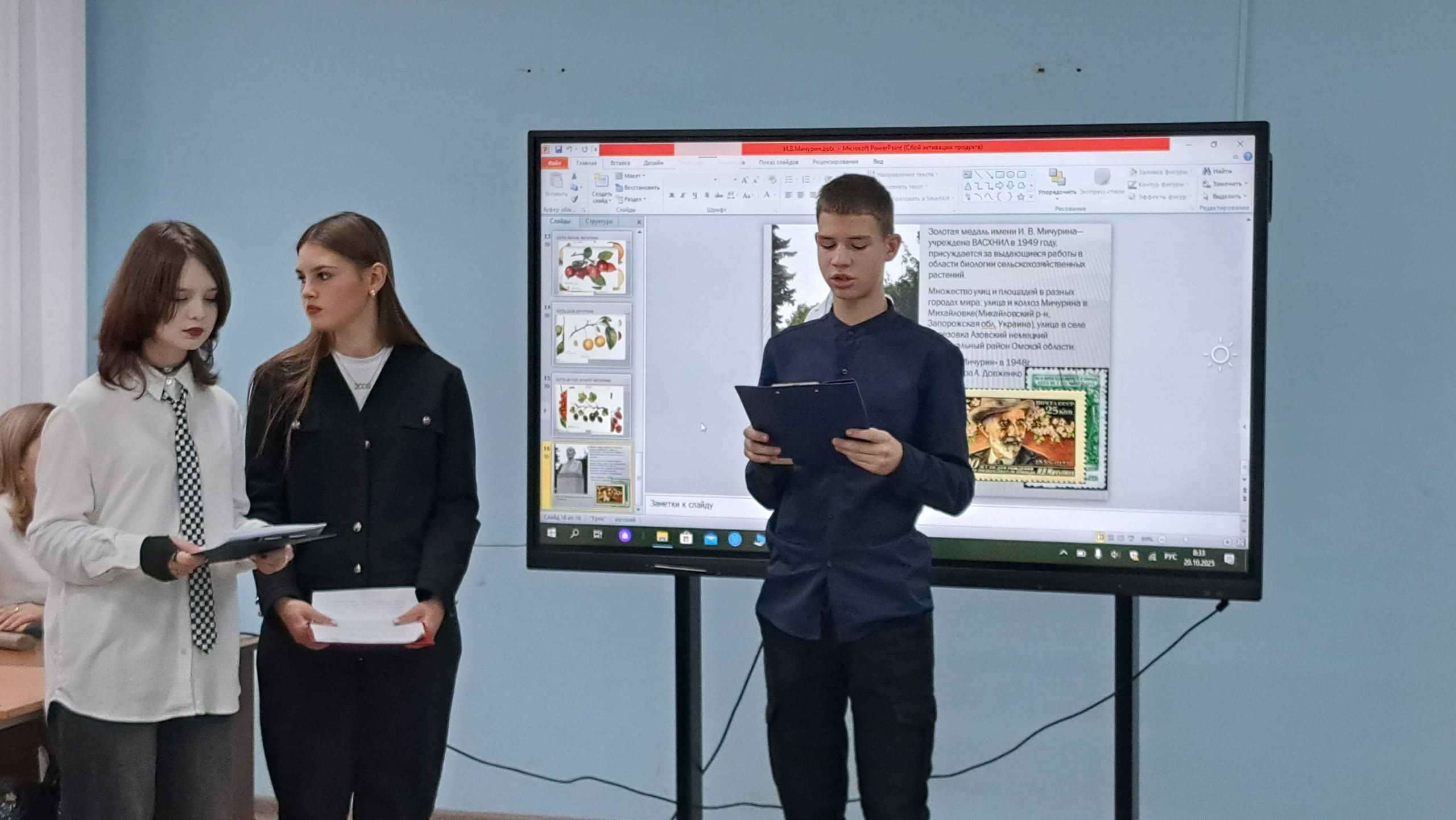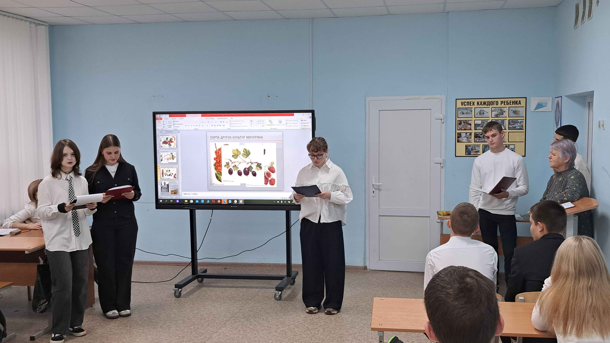 20 октября 2025 года заведующая Стаевским сельским филиалом Т.В.Новичкова совместно с завучем по воспитательной работе Е.С. Пичугиной и учениками 9 – 11 классов в Стаевской СОШ провели юбилейный вечер «Великий садовод». Мероприятие посвящено 170- летию со дня рождения Ивана Владимировича Мичурина. Вечер сопровождался слайдовой презентацией.