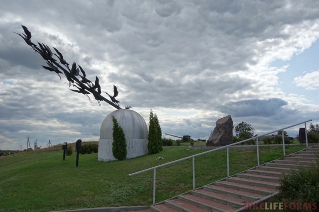 Когда подходишь к памятнику начинают звучать песни военных лет, среди которых “Журавли” в исполнении Марка Бернеса.