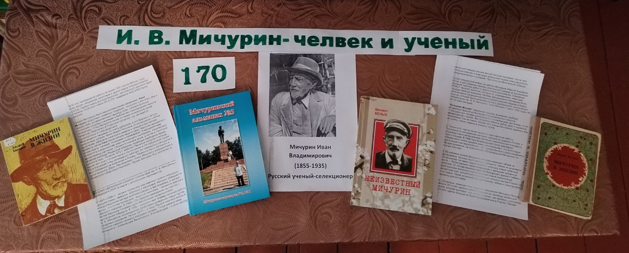 На книжной выставке «И. В. Мичурин-человек и ученый» была представлена литература о жизни и трудах знаменитого агронома.