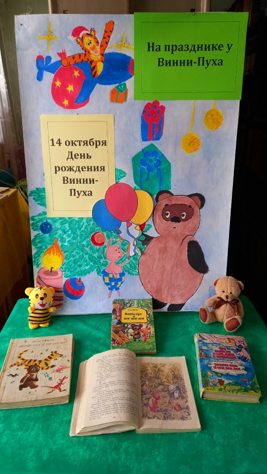 Ко дню рождения медвежонка в Новоюрьевской сельской библиотеке оформлена выставка под названием «На празднике у Винни-Пуха». Своим появлением сказка «Винни-Пух» обязана сыну Алана Милна, Кристоферу Робину. Автор книги подарил на день рождения сыну купленного в универмаге плюшевого медвежонка, который вдохновил писателя на создание этой сказки. Кристофер назвал своего нового друга Винни-Пухом, в честь медведицы Виннипег, жившей в Лондонском зоопарке.