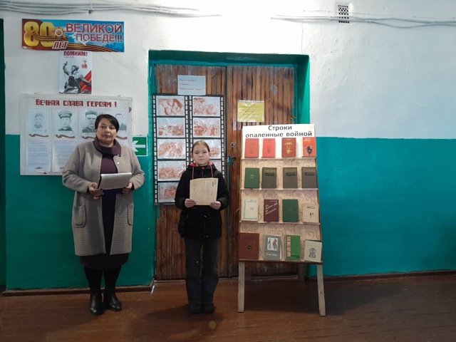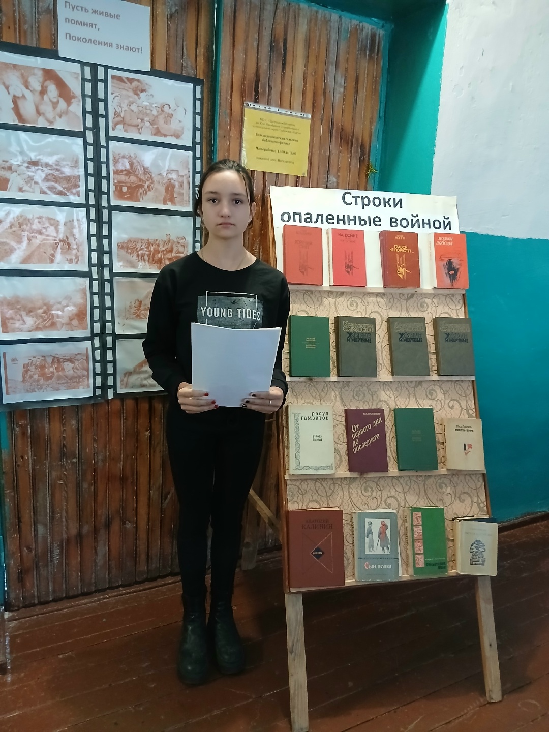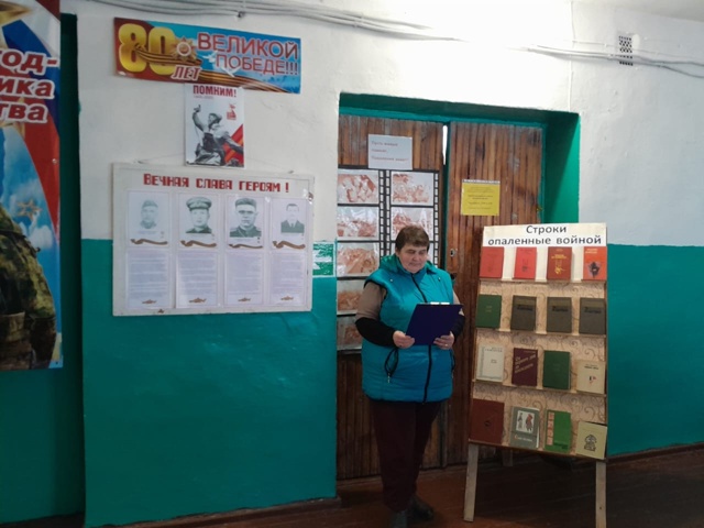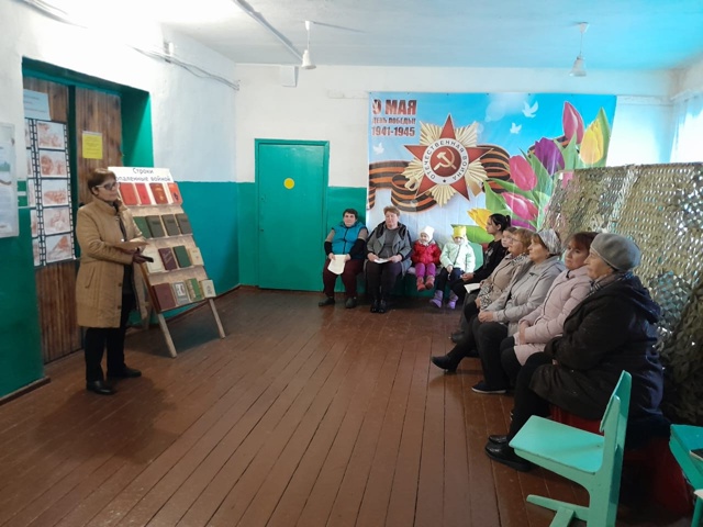 18 октября библиотекарь Каргальцева О.А совместно с заведующей СДК Чижиковой Г.Д провели мероприятие Литературную гостиницу” Строки опаленные войной ” Библиотекарь ознакомила гостей с поэтами фронтовиками Ю. Друниной, А. Твардовским, К. Симановым и др. Гости получили возможность прочитать стихотворения о войне известных поэтов, пели песни о ней.
