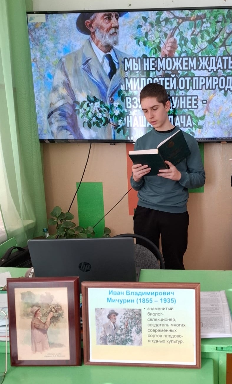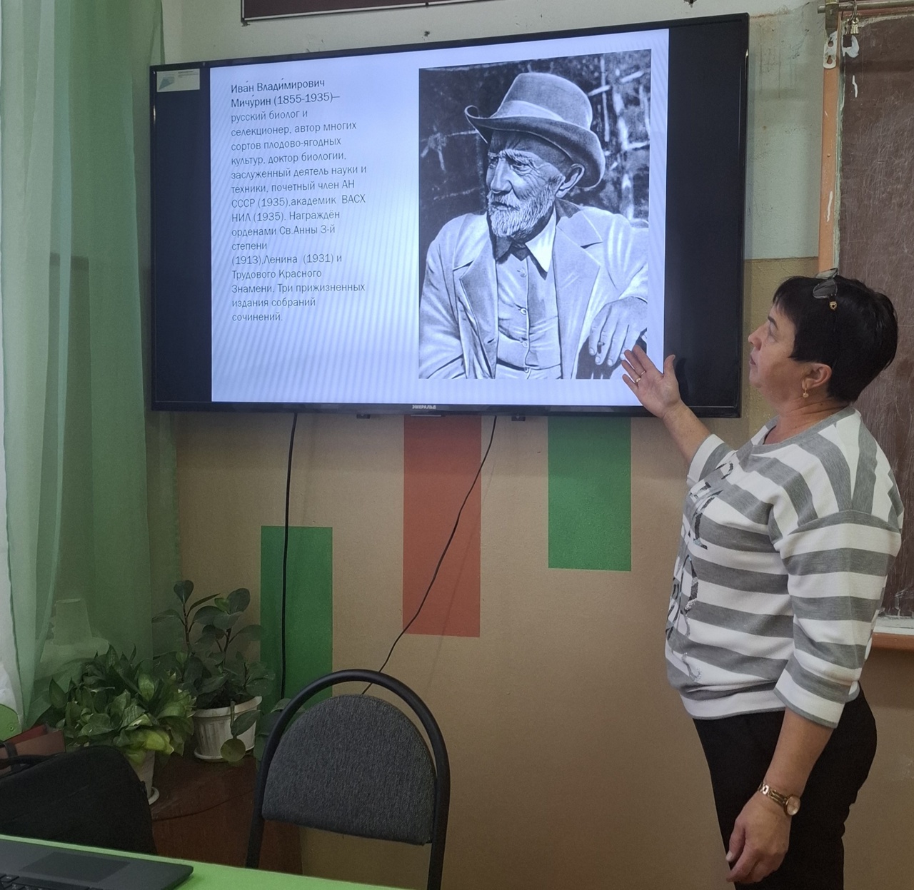 Библиотекарь познакомила присутствующих с биографией  и научной деятельностью Ивана Владимировича Мичурина. Рассказала о том, что благодаря своим новаторским идеям в области селекции растений Мичурин сумел вывести множество сортов яблонь, вишен и других плодовых и ягодных культур.