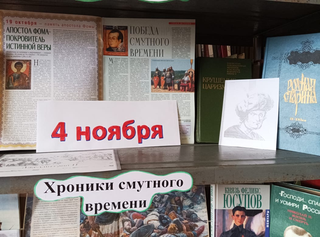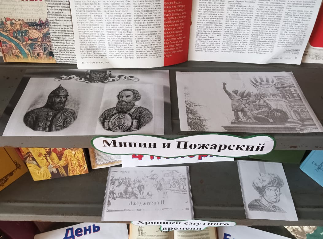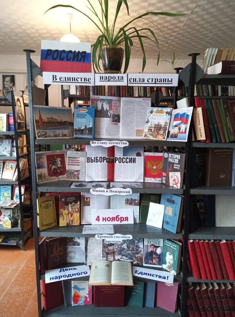 В преддверии этого события в читальном зале Питимского филиала оформлена историко – просветительская выставка “В единстве народа – сила страны”. Она направлена напомнить посетителям о событиях 400-летней давности, послужившим причиной рождения праздника- народного единства, пробежаться по страницам истории смутного времени, освобождения Москвы от польских интервентов, о роли Кузьмы Минина и Дмитрия Пожарского в объединении Родины. Представленные на выставке книги расскажут любознательному читателю о главных вехах в истории нашего государства, о знаменательных событиях, сплотивших многонациональный народ в единую силу, ведь именно единство нации помогает нашей Родине оставаться сильной и непобедимой.