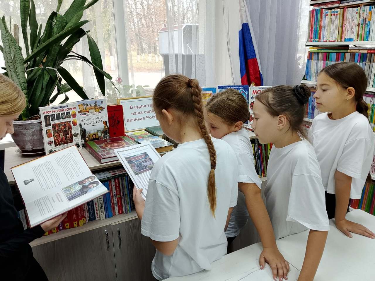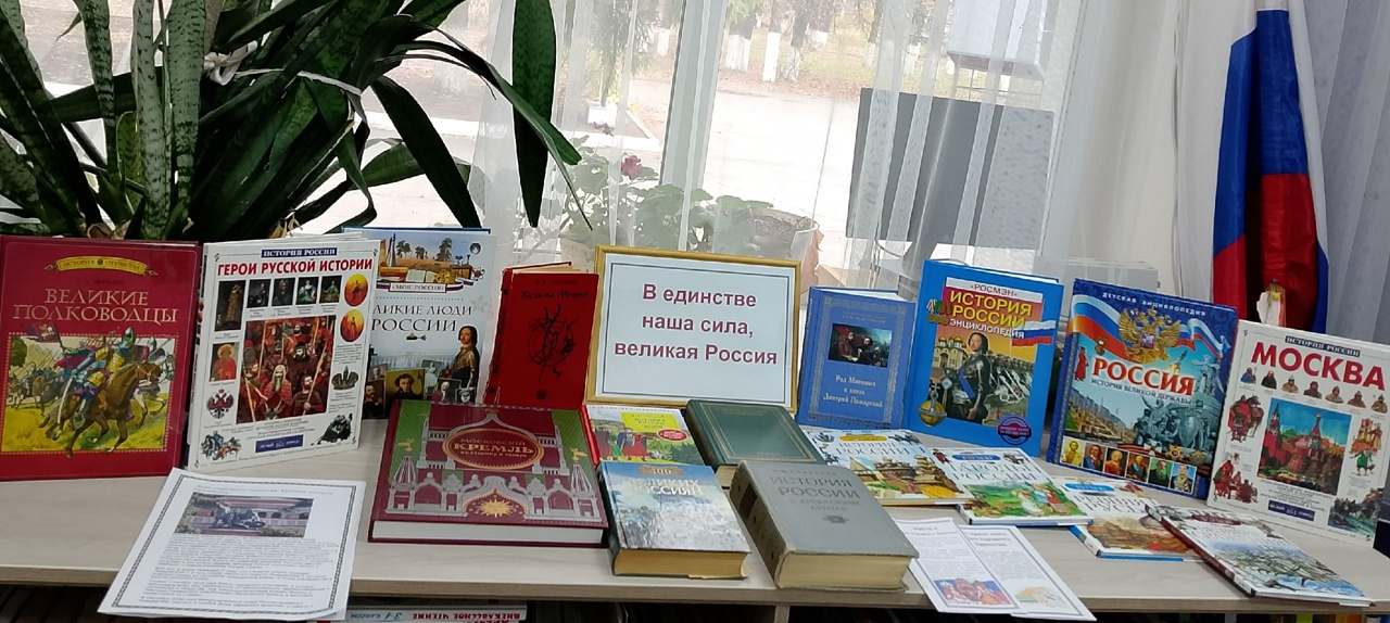 📚В завершение участники мероприятия с увлечением ознакомились с тематической выставкой “В единстве наша сила, великая Россия”. Выставка познакомит с книгами об истории России, о русском народе, о важнейших русских битвах и сражениях, о русских полководцах, о великих людях России.