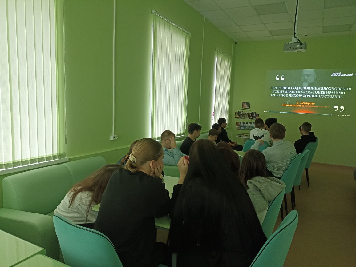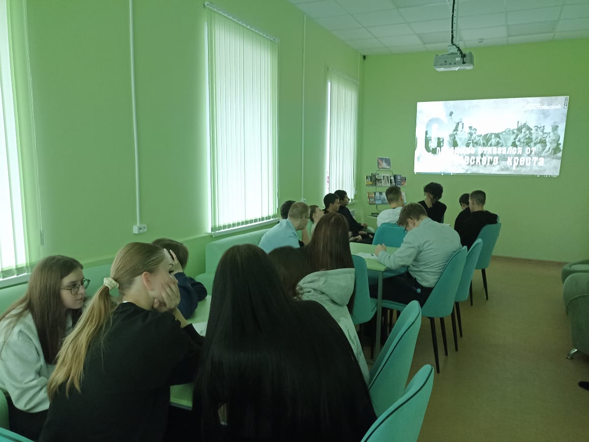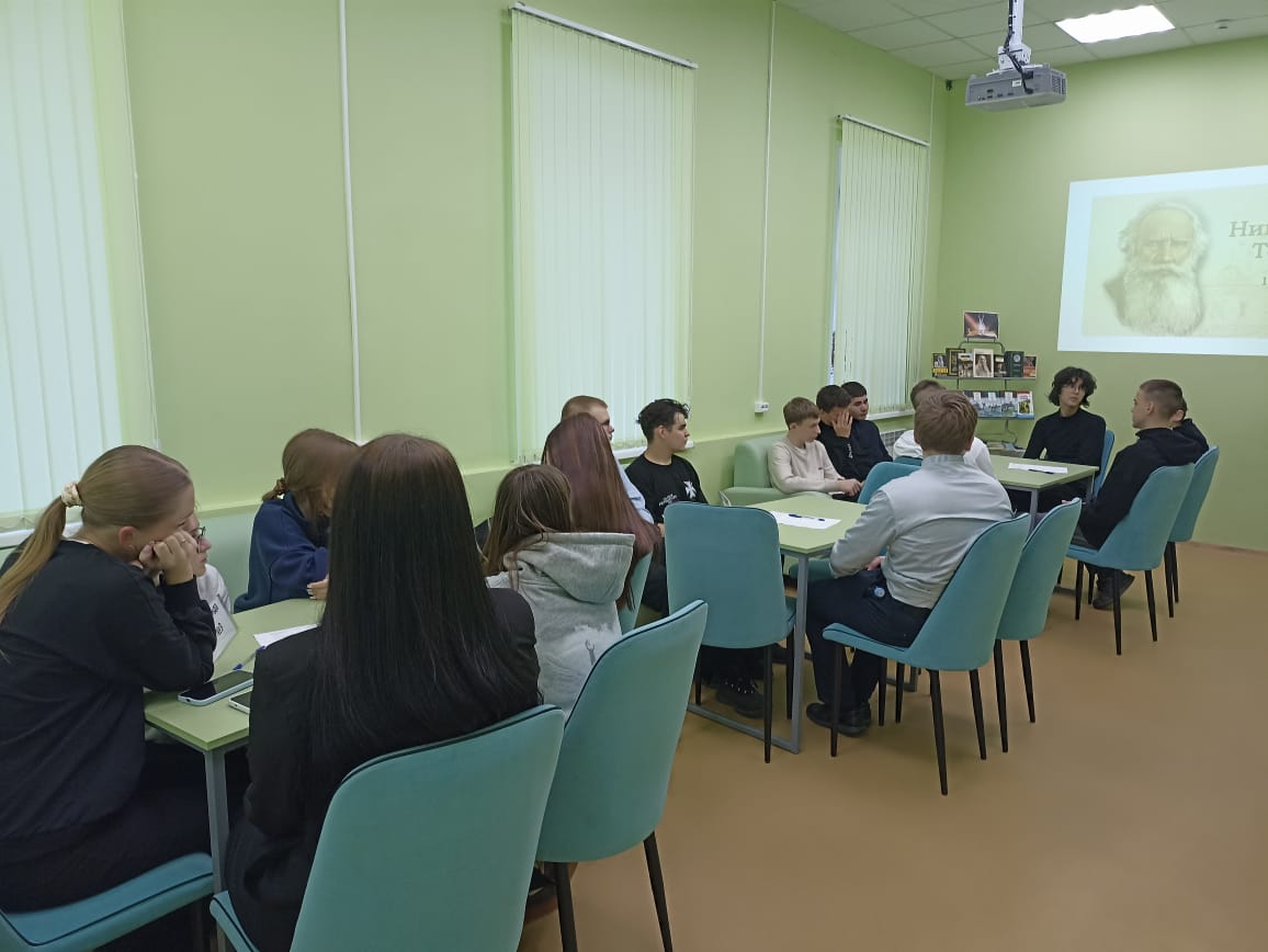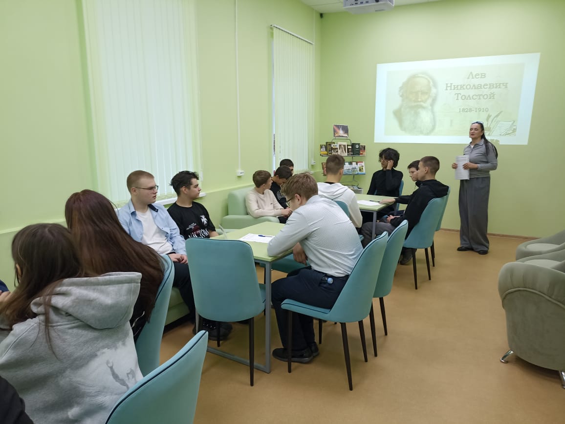 В ходе встречи учащиеся девятого класса МБОУ СОШ №1 посмотрели документальный фильм о писателе, являющийся частью образовательного проекта «Лекторий Достоевский» и рассказывающий о самых важных событиях и людях в истории России. После просмотра школьники стали участниками квеста по творчеству писателя и познакомились с литературой, представленной на книжной выставке «Живое слово Льва Толстого».