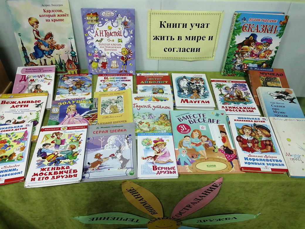 В преддверии Дня толерантности в Рудовской сельской библиотеке для юных читателей оформлена книжная выставка «Книги учат жить в мире и согласии». На ней представлены книги, которые учат уважительному отношению к людям и всему, что нас окружает: В. Железников «Чучело», В. Катаев «Цветик-семицветик», Р.Киплинг «Маугли», С.Маршак «Двенадцать месяцев» и много других произведений, которые раскроют перед читателями такие качества, как взаимопонимание, милосердие, уважение к обычаям и традициям разных народов. А также напомнят о необходимости по-доброму относиться друг к другу, ценить дружбу, быть терпеливыми и вежливыми.