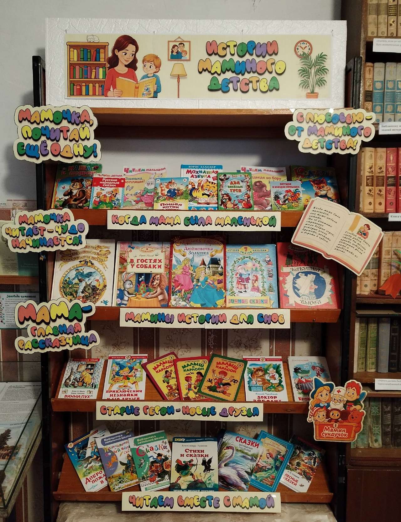 В преддверии самого светлого и доброго праздника Дня матери в нашей библиотеке оформлена книжная выставка “Истории маминого детства”, состоящей из четырех разделов: “когда мама была маленькой”, “мамины истории для снов”, “старые герои-новые друзья”, “читаем вместе с мамой”.