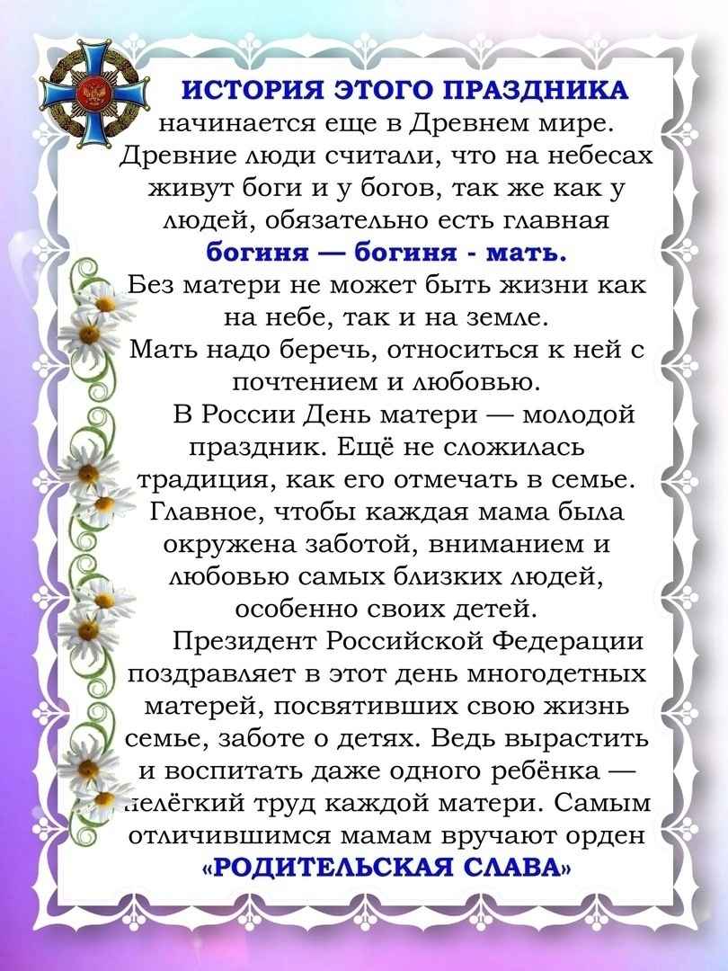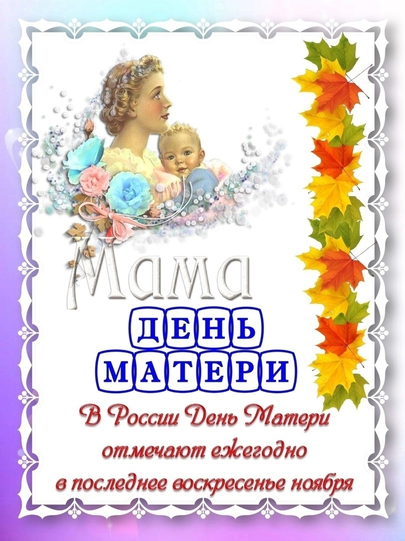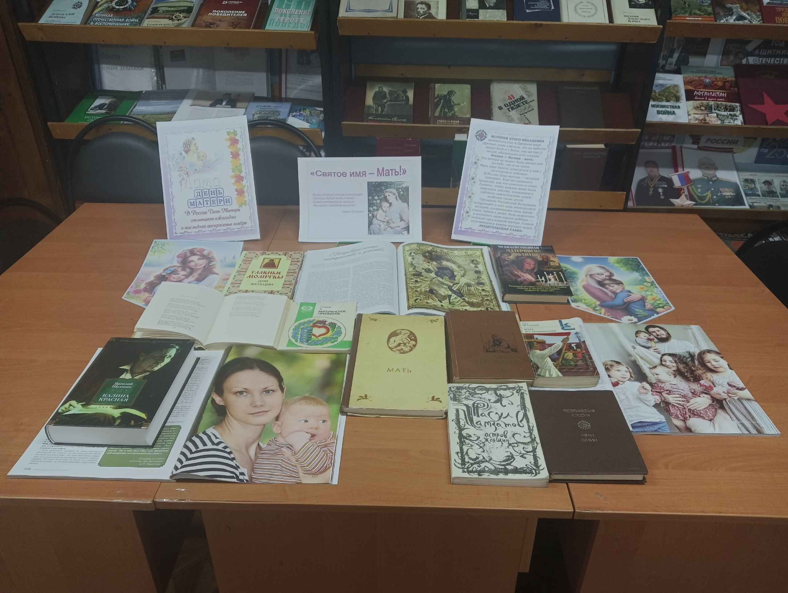 Ко Дню Матери, который отмечается в России в последнее воскресенье ноября, в центральной библиотеке оформлена книжная выставка «Святое имя-Мать!», на которой представлены книги о материнском мужестве, о том, что надо беречь близких, пока они с тобой, не жалеть для них тепла своей души. Образ Матери в литературе — это воплощение и любви, и счастья, и вдохновения. И эта тема будет вечной, так как Мать- продолжение рода человеческого и русских традиций. Поэтому совсем неудивительно, что многие писатели и поэты черпают вдохновение именно в воспоминаниях о детстве, о доме, о матери. На выставке представлены произведения М. Горького, В. Шукшина, И. Бунина, Ч. Айтматова, Р. Гамзатова и др.