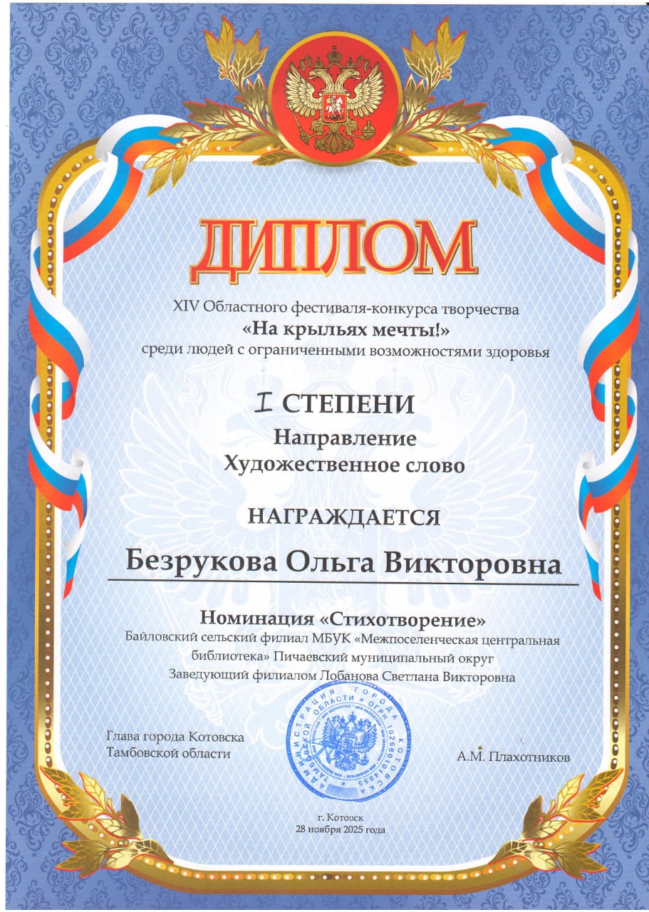 На конкурс было подано 107 заявок. Свои таланты показали около 200 участников. В номинации “Художественное слово” приняла участие читатель  Байловского сельского филиала Ольга Безрукова. Она награждена дипломом 1 степени, заведующему филиалом Светлане Лобановой вручено благодарственное письмо.