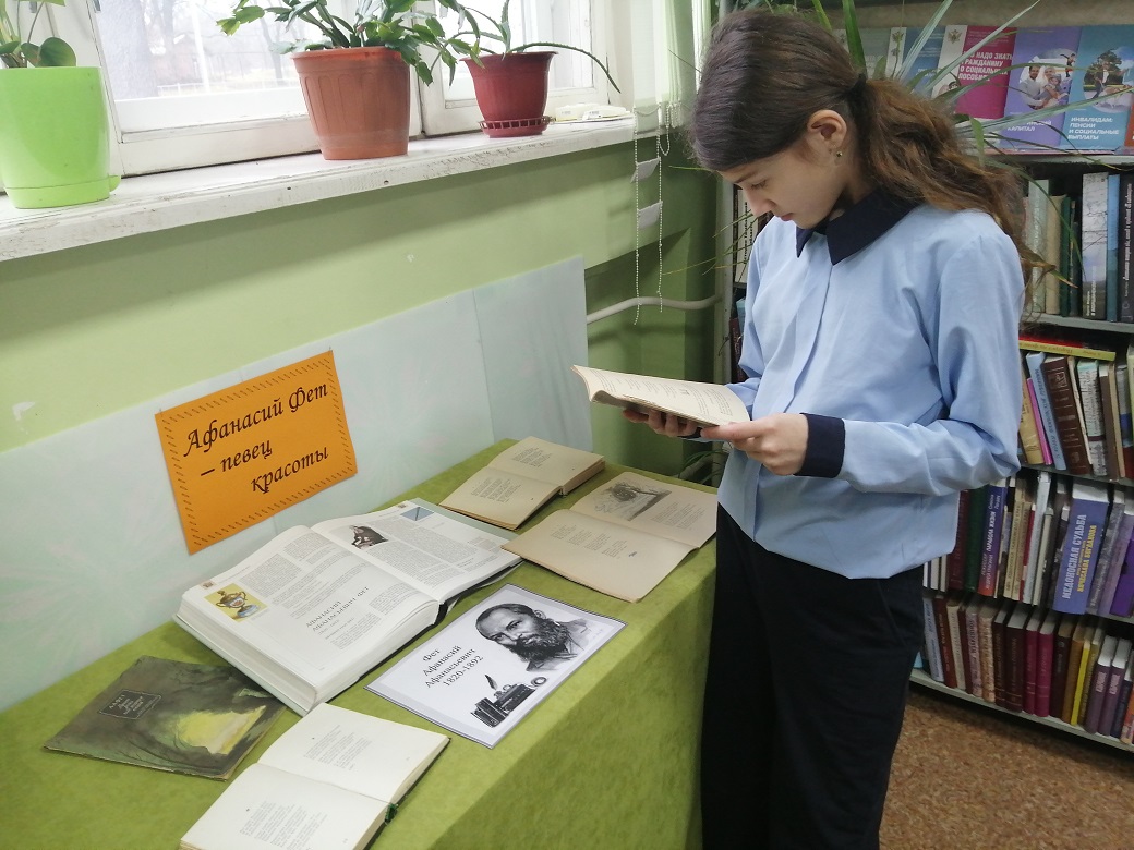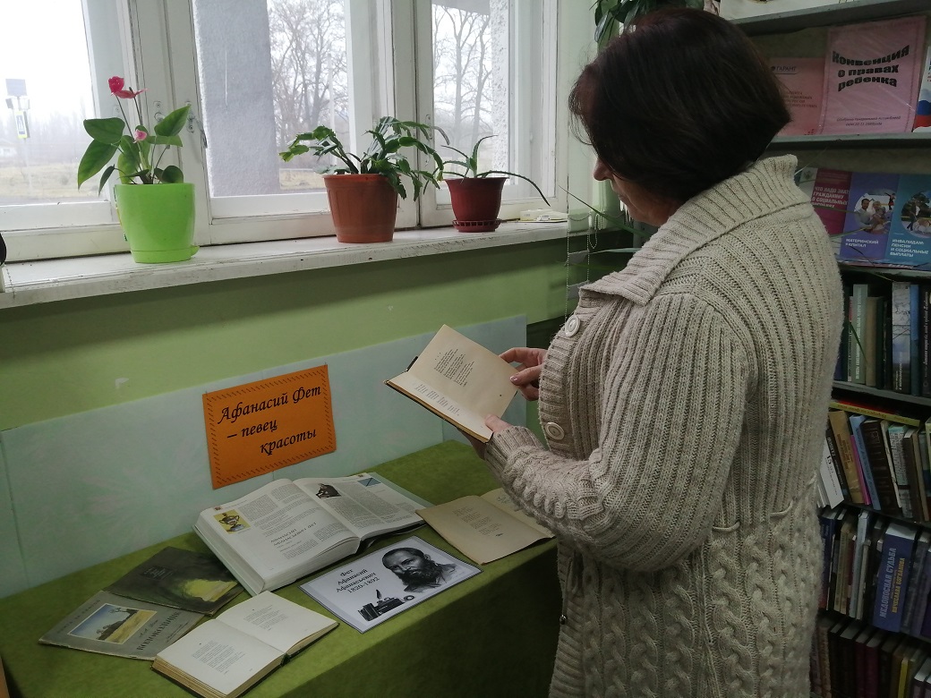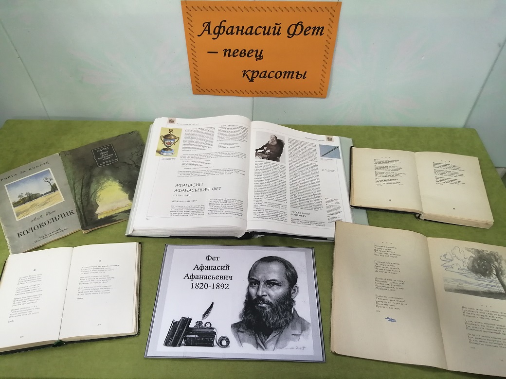 В 205-й день рождения известного русского поэта-лирика и переводчика, члена-корреспондента Петербургской академии наук – Афанасия Афанасьевича Фета читателей Рудовской сельской библиотеки встречает книжная выставка «Афанасий Фет – певец красоты». Она предлагает окунуться в высокий и романтический мир лирики поэта и знакомит с основными этапами его жизни.