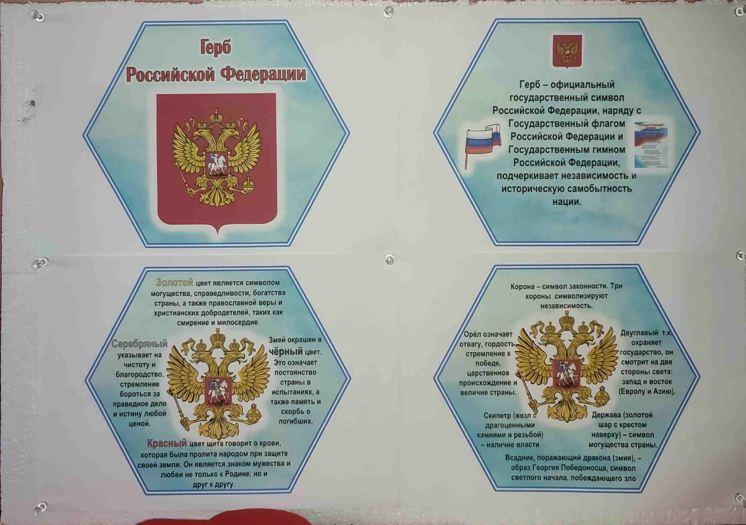 У орла — нагрудный щит —                                                                                                                                                                                                                                                                              Воин на коне сидит.                                                                                                                                                                                                                                                                                    Змея он копьём пронзает,                                                                                                                                                                                                                                                                              Родину от зла спасает.