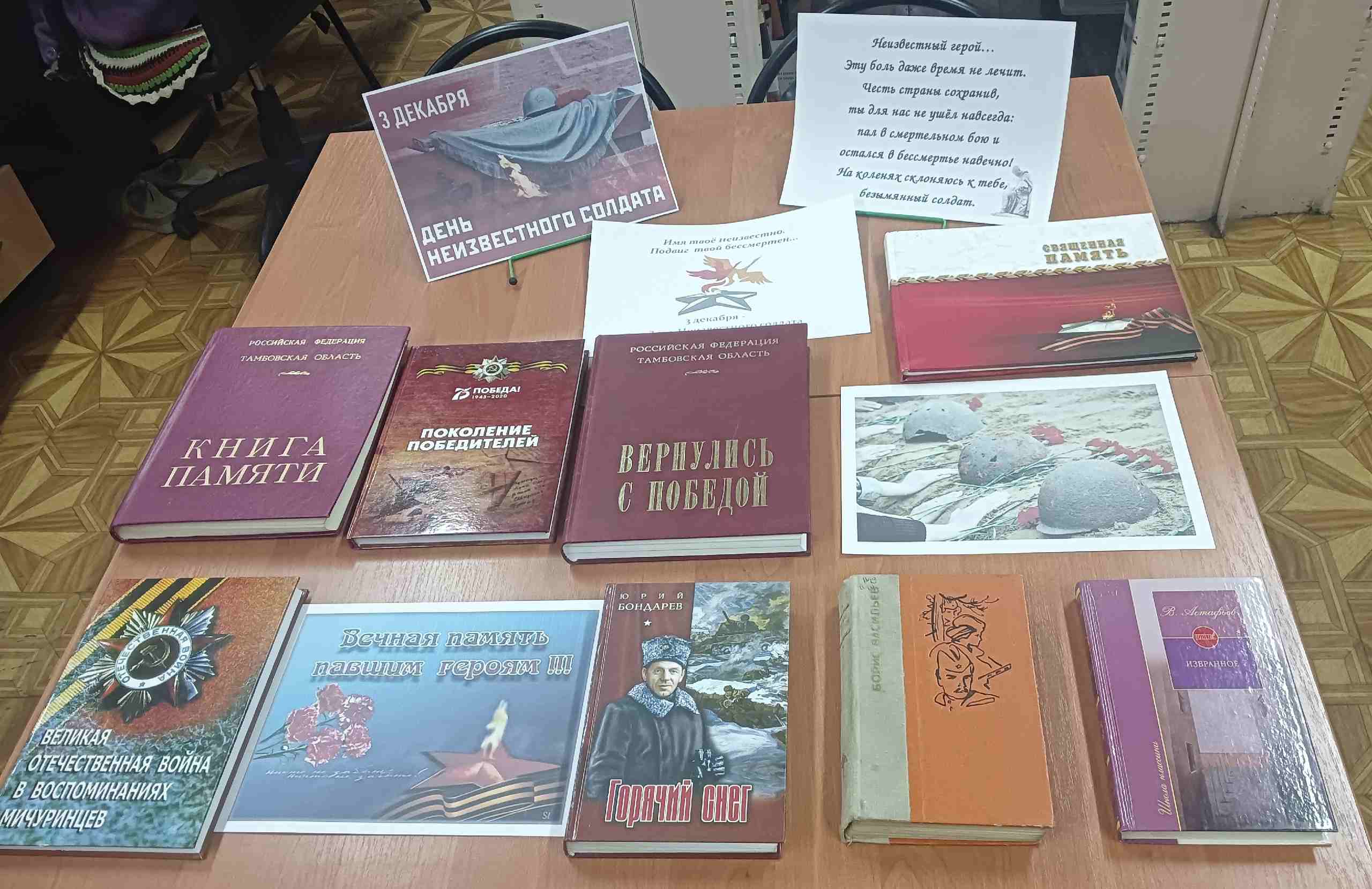 К этой дате в центральной библиотеке оформлена книжная выставка, на которой представлены книги, рассказывающие о героизме советских солдат в годы Великой Отечественной войны, о подвигах неизвестных героев, имена которых навсегда останутся в памяти поколений.