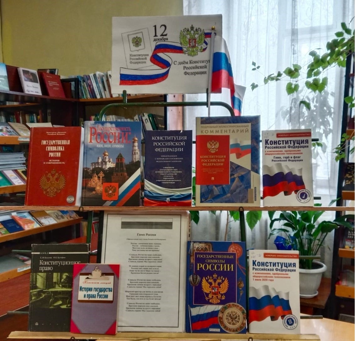 12 декабря, в День Конституции Российской Федерации, состоялась встреча в отделе пенсионного фонда по Бондарскому округу с представителями старшего поколения центра общения «Второе дыхание» и активистами регионального отделения партии «Единая Россия». На мероприятие были приглашены сотрудники библиотеки, которые познакомили присутствующих с историей Конституции, рассказали о ее ключевых главах и разделах, а также подробно остановились на важных изменениях, внесенных в Конституцию 1993 года за последние годы. В завершение встречи участники проверили свои знания в увлекательной викторине. В библиотеке была оформлена книжная выставка, на которой представлены книги, посвященные истории создания Конституции.