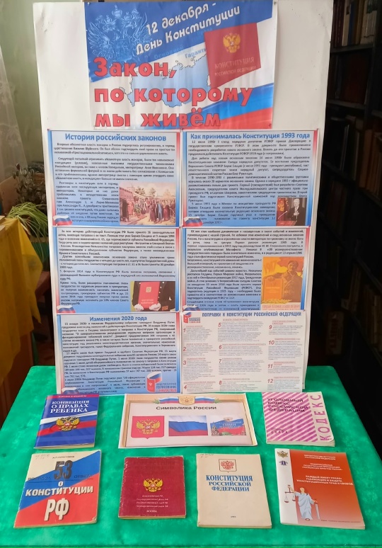 В честь этого события 11 декабря в Новоюрьевской сельской библиотеке открылась книжно-иллюстративная выставка «Закон, по которому мы живём». Выставка — это уникальное путешествие по истории и содержанию Основного закона.
