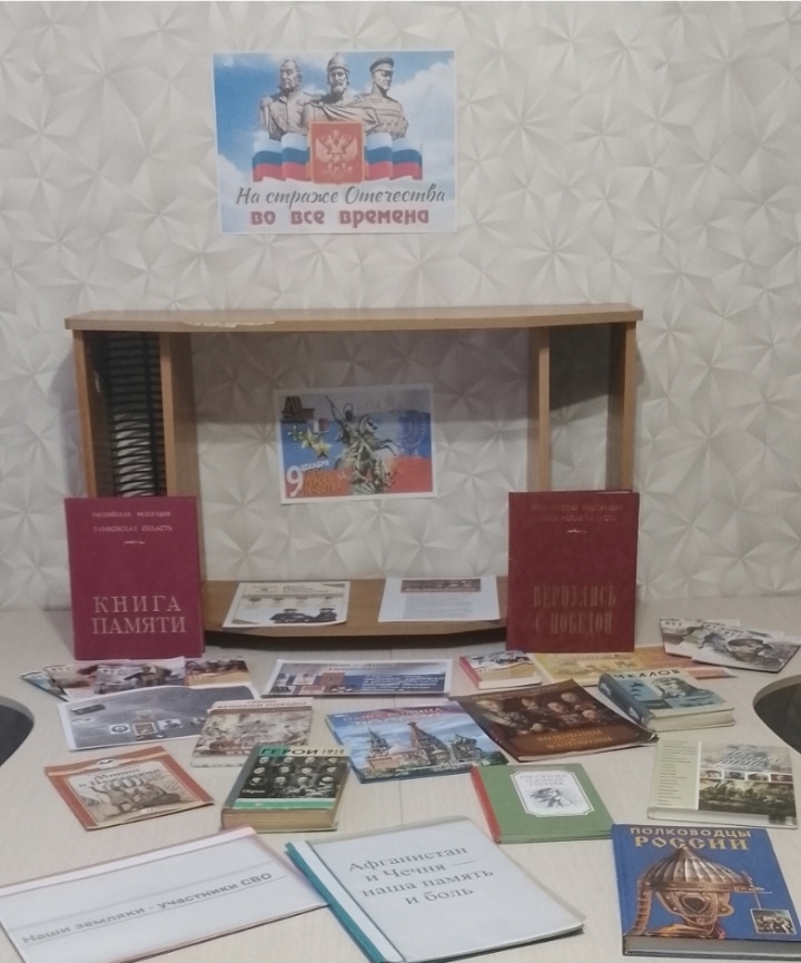 В честь этого события в Устьинском сельском филиале организована книжная выставка “На страже Отечества во все времена”, посвященная героям нашей страны. На выставке можно увидеть книги о выдающихся личностях, которые внесли свой вклад в историю России. Также на выставке представлена литература, которая рассказывает о героях, прославивших нашу малую Родину. В современной России есть свои герои, которые могут служить примером для всех нас. Предлагаем нашим читателям познакомиться с информацией о подвигах российских солдат а наши дни.