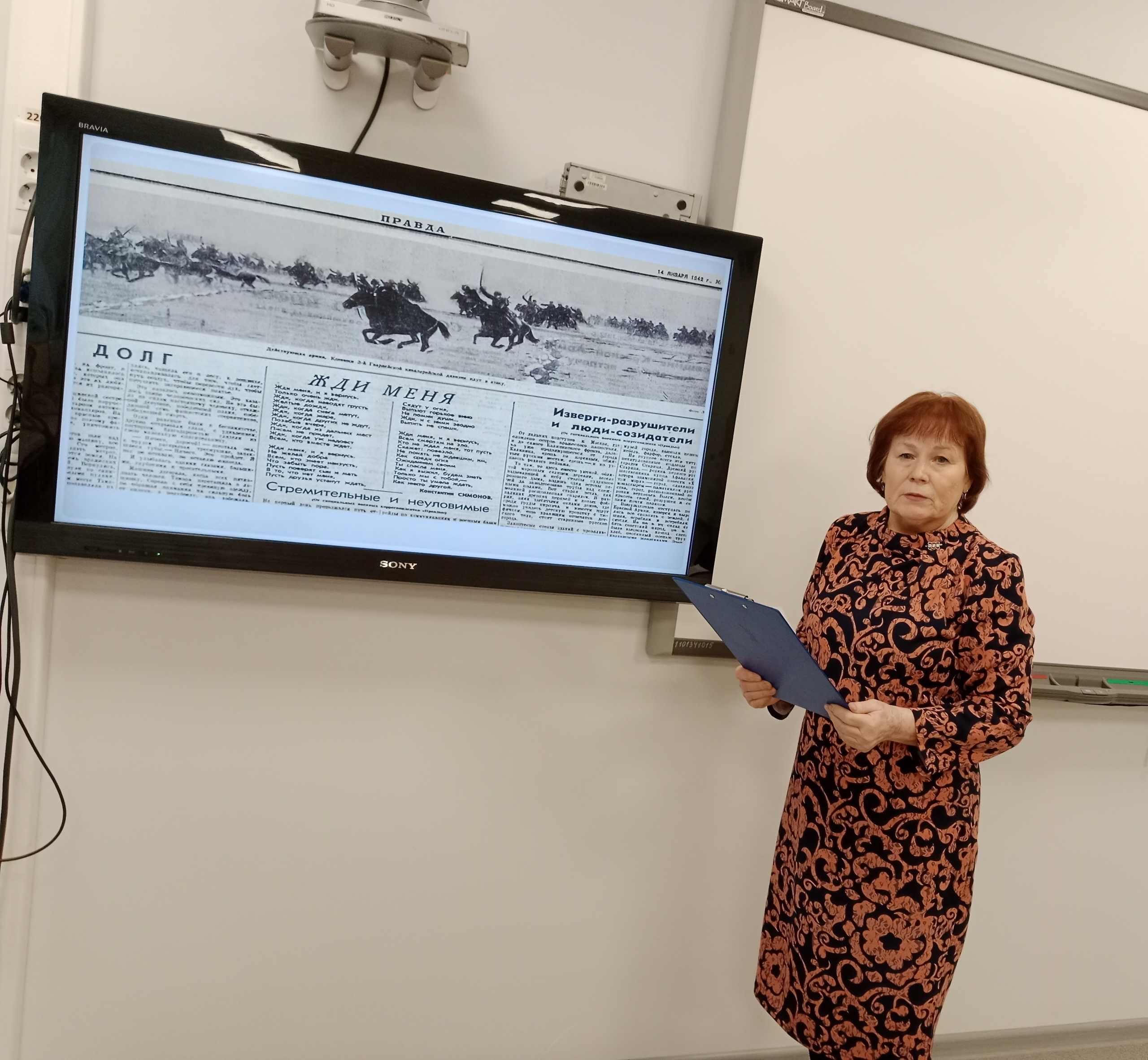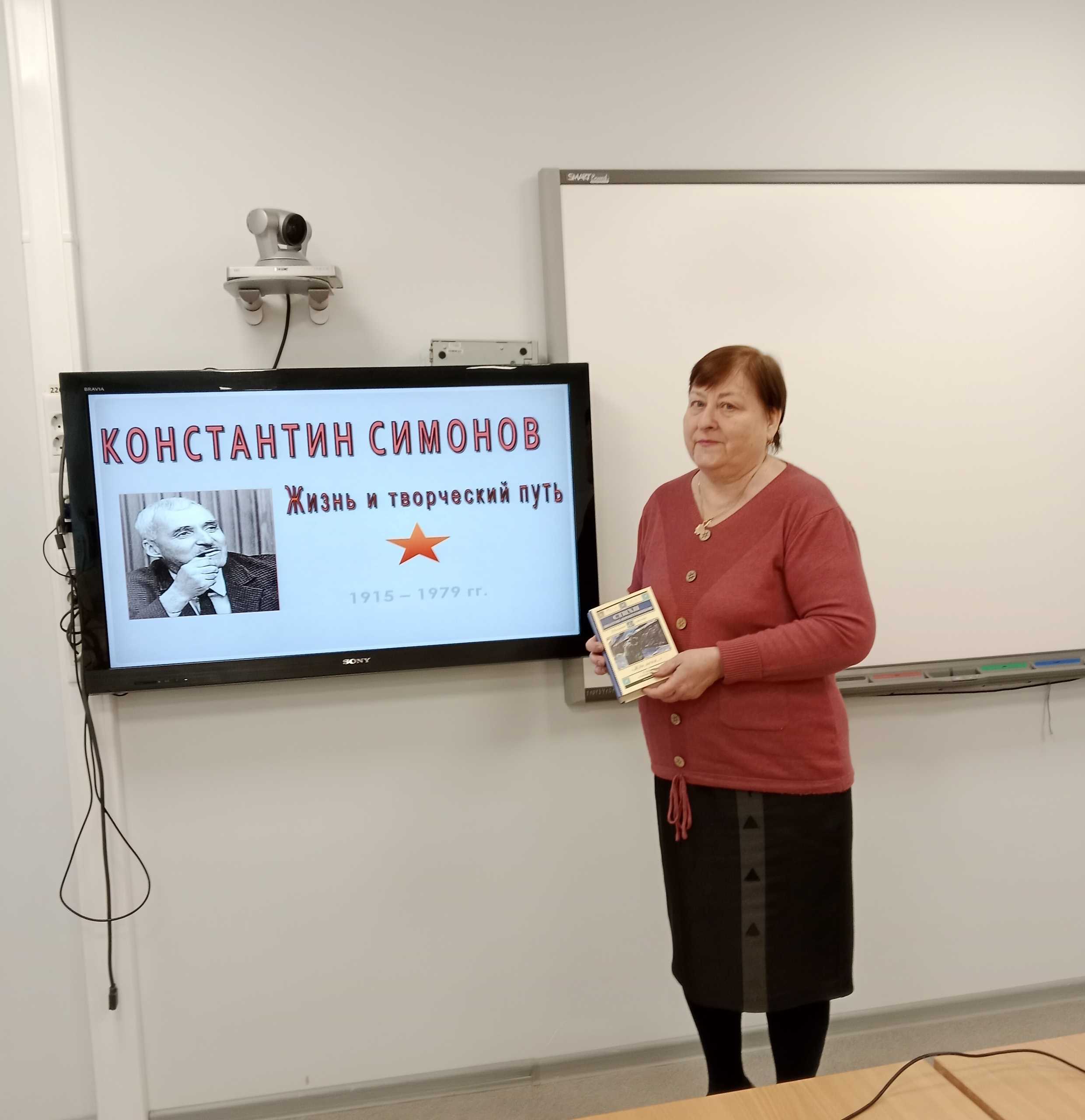 28 ноября 2025 года исполнилось 110 лет со дня рождения Константина Михайловича Симонова — поэта, писателя, военного корреспондента, одного из самых значимых голосов советской литературы XX века. Самой главной темой его творчества была Великая Отечественная война – правда войны, мужество и стойкость солдат и офицеров, преданность воинскому долгу и Родине, нерушимая вера в победу, любовь и верность, дружба и благородство. 18 декабря работники библиотеки провели для учащихся 9 класса литературный час «В огне написанные строки». Библиотекари Ширшова Т.И. и Бочарова Н.М. рассказали гостям о жизненном пути Константина Михайловича Симонова: о его юности, работе фронтовым корреспондентом газеты «Красная звезда», о том, как его стихи и очерки становились голосом солдат на фронте. Константин Симонов побывал на всех фронтах, прошел военными дорогами от Москвы до Берлина, видел войну своими глазами и передавал ее правду в своих произведениях. Участники мероприятия узнали не только основные вехи его биографии, но и истории создания самых знаменитых произведений.