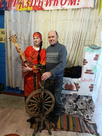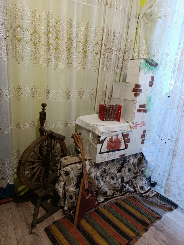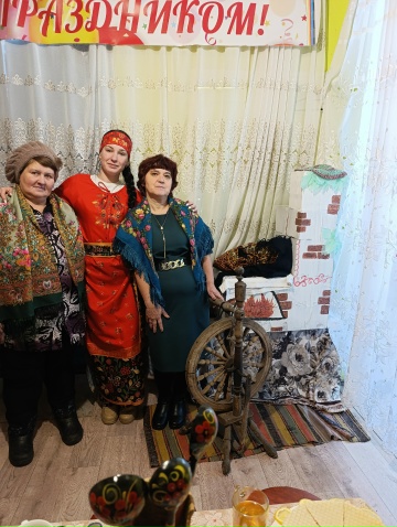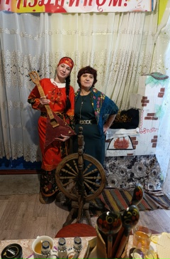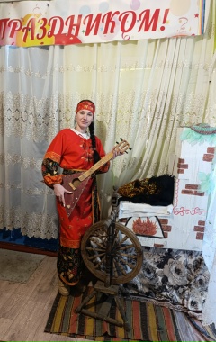 Библиотекарь встречала гостей в уютной русско- народной атмосфере.