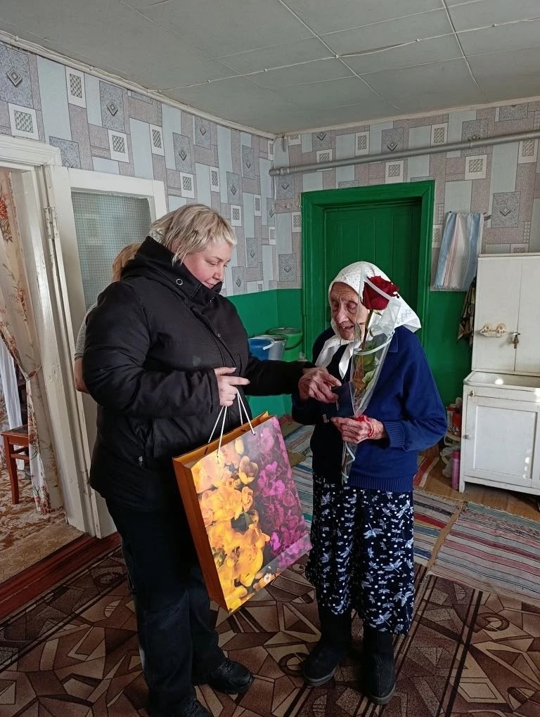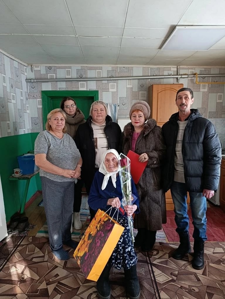 В доме юбилярши собрались начальник территориального отдела села Вишневое, работники культуры и соседи. Вручили цветы, открытки, подарок, и музыкально-поэтические поздравления.