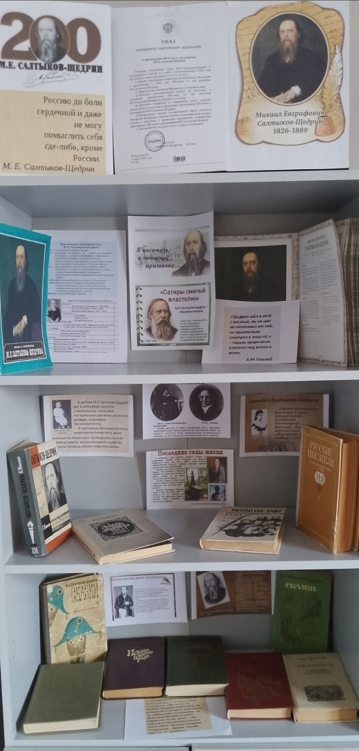 27 января 2026 года литературный мир отмечает 200- летний юбилей писателя, чье имя стало синонимом острой социальной и гражданской смелости. Михаил Евграфович Салтыков-Щедрин занимает особое место в русской литературе, он был не только гениальным писателем, но и честным общественным деятелем, ответственным чиновником, что придавало его критике особую глубину и достоверность. Его творчество чрезвычайно многоообразно . Но среди огромного наследия, едва ли не наибольшей популярностью пользуются его увлекательные сказки. Сказки Салтыкова-Щедрина называют “малой энциклопедией сатиры”. Они итог многолетних наблюдений, всего его творчества, богаты яркими образами и необычными оригинальными сюжетами. В рамках юбилея в Устьинском сельском филиале оформлена книжная выставка “Сатиры смелый властелин”, выставка представляет литературу о жизни и творчестве великого русского писателя и его произведения.