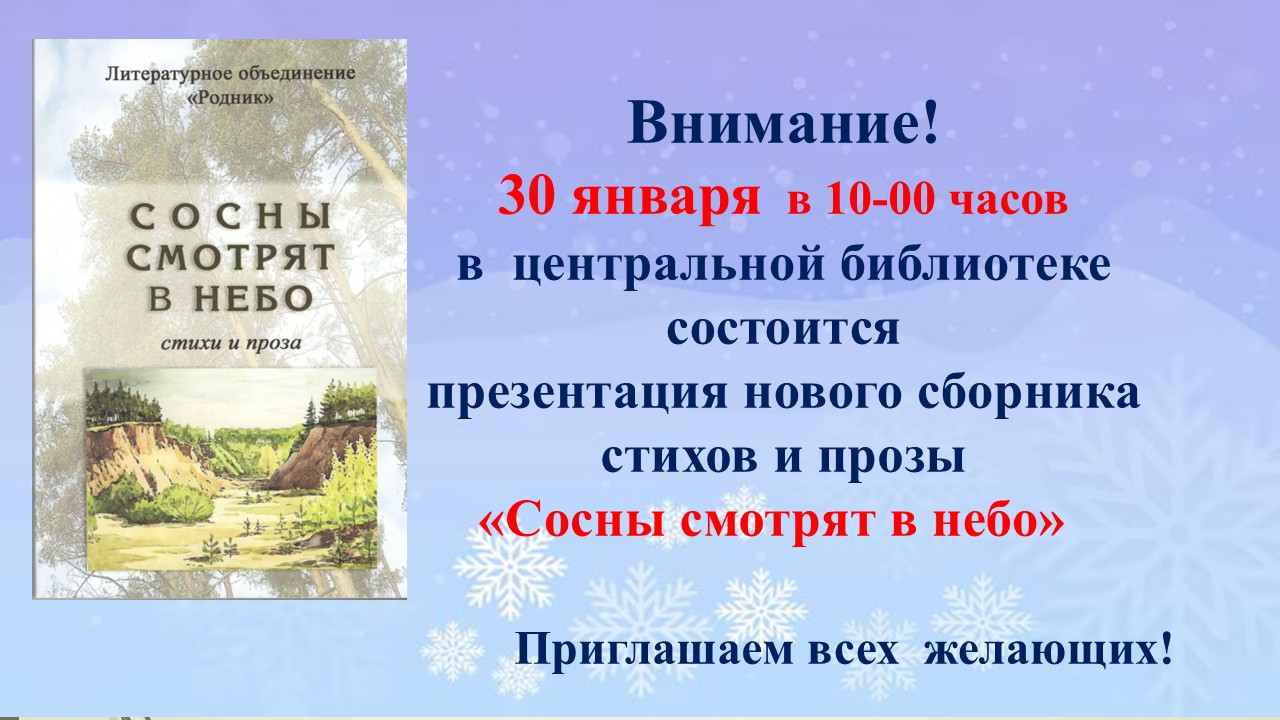 Презентация нового сборника стихов и прозы “Сосны смотрят в небо”user_sosnovka28.01.2026Анонс, Литературное объединение "Родник", Центральная библиотека Количество просмотров: 20 Пред. Запись Информационная книжная выставка "Город в сердце: память о блокаде Ленинграда" След. Запись Час истории "Ленинград. Блокада. Память."