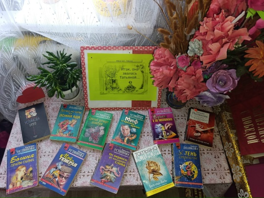 25 января ежегодно отмечается Татьянин День, накануне праздника 24 января библиотекарь Спасской сельской библиотеки оформила книжную выставку «Итак, она звалась Татьяной…». На книжной выставке представлены произведения Татьяны Устиновой и Татьяны Поляковой.
