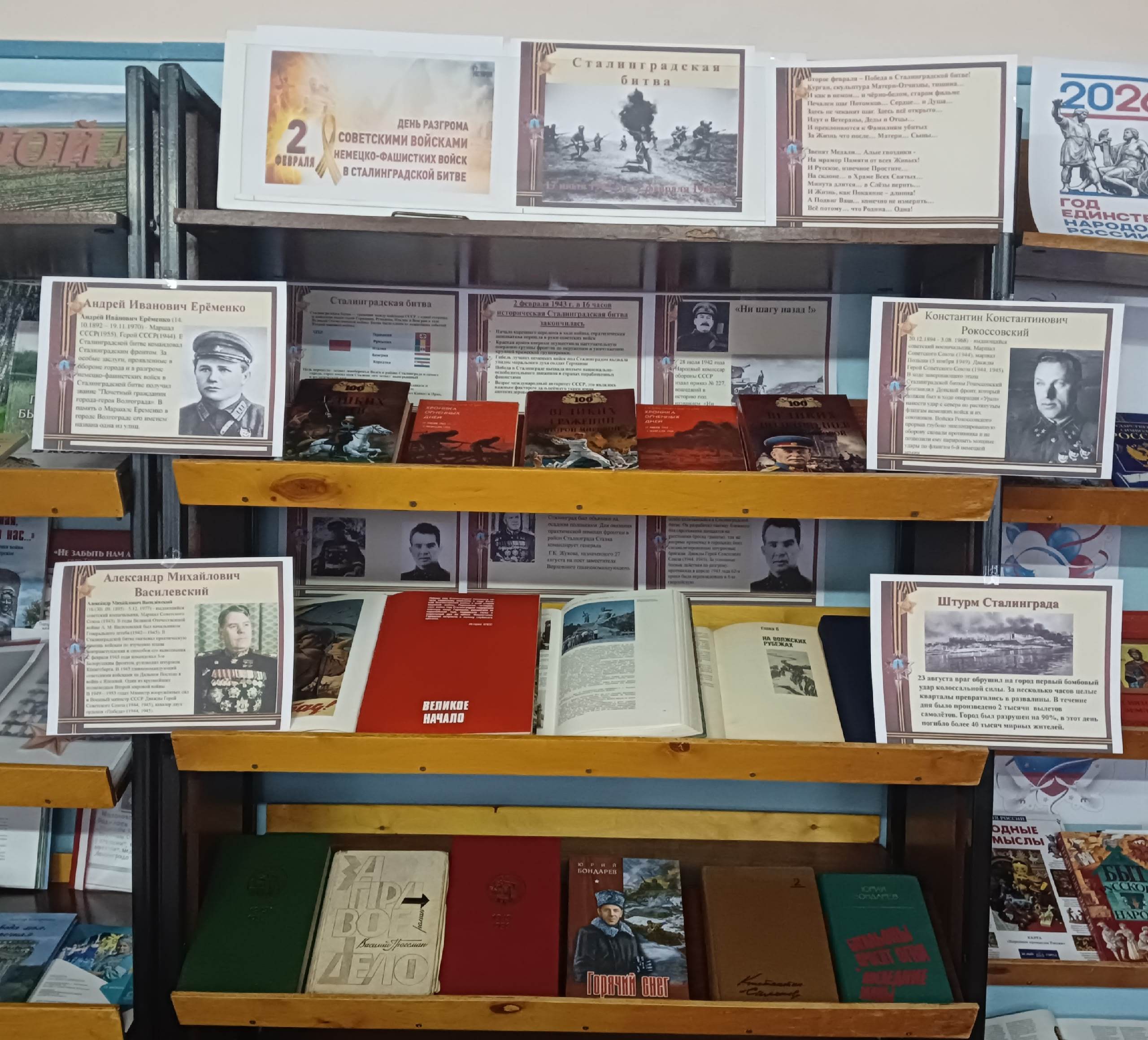 В центральной библиотеке оформлена книжная выставка, посвящённая Сталинградской битве. Она знакомит с историей этого сражения, рассказывает о том, как в неравном бою доставалась победа нашему народу, о том, как много пало в той битве воинов, отдавших жизнь за нашу Родину. Читатели библиотеки могут познакомиться с такими художественными произведениями как: «Живые и мёртвые» Константина Симонова, «Горячий снег» Юрия Бондарева, «Сталинградская битва. Наша победа. 1942-1943» под редакцией И.А. Маневича, «Самые известные сражения» под редакцией В. Зусева, «Рассказы о войне» С. Алексеева и другими. Выставка направлена на то, чтобы помочь подрастающему поколению лучше узнать историю своей страны и навсегда сохранить в сердце благодарность к людям, завоевавшим мир на Земле.