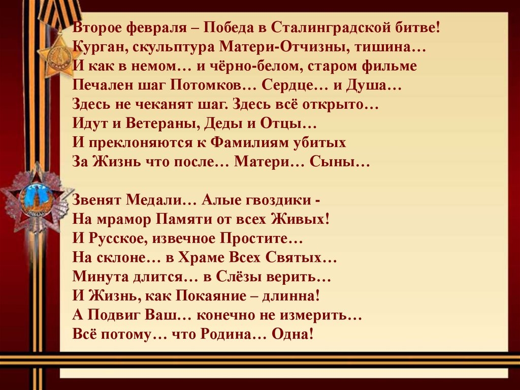 2 февраля- День разгрома советскими войсками немецко-фашистских войск в Сталинградской битве (1943).