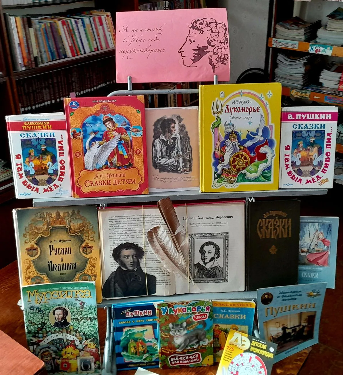 В детской библиотеке прошел конкурс рисунков «Путешествие в сказки Пушкина». В рамках конкурса детям предлагалось нарисовать иллюстрацию к любимой сказке А.С. Пушкина или своего любимого сказочного героя. В конкурсе приняли 10 человек. Все участники получили сладкие призы.
