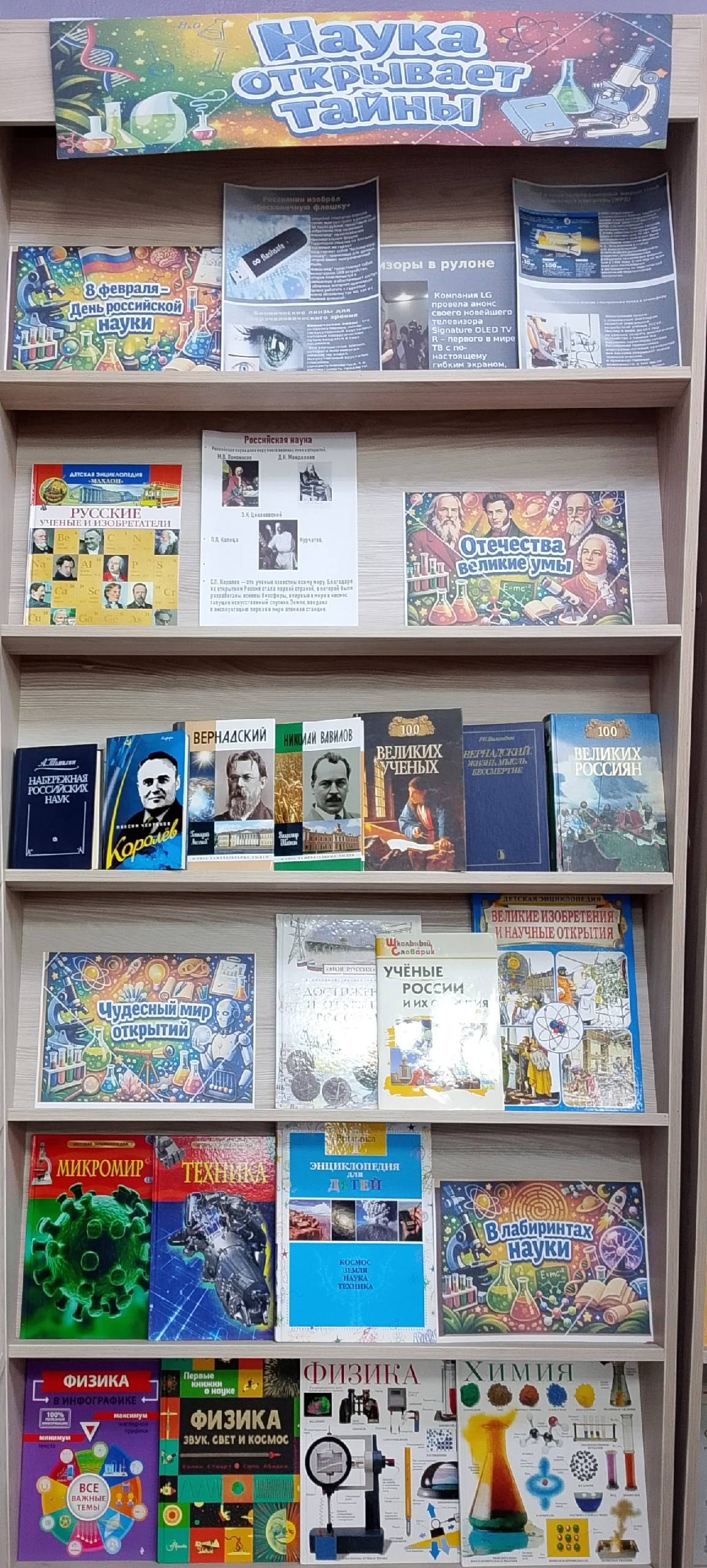 Книжная выставка “Наука открывает тайны”, в Новоникольском филиале, посвящённая Дню Российской науки, раскрывает перед пользователями страницы энциклопедических и научно-познавательных изданий, рассказывающих о развитии Отечественной науки со времён Михаила Ломоносова до наших дней.