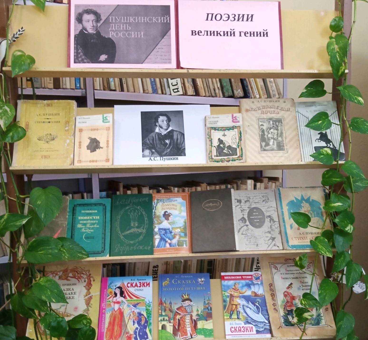 Накануне в библиотеке была оформлена книжная выставка: “Поэзии великий гений”. На выставке представлены произведения поэта для самых разных читателей. Для детей- сказки, а старшему возрасту – Пушкинскую прозу: “Повести Белкина “, ” Полтава “, ” Капитанская дочка “, лирика.