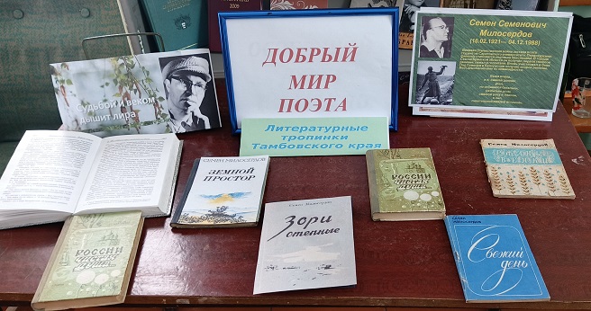Тамбовский край всегда был богат талантливыми людьми, среди них – прекрасный, удивительный поэт – Семён Семёнович Милосердов. В феврале исполняется 105 лет со дня рождения поэта чистой души и доброго сердца. Главный мотив поэзии Семёна Милосердова, по его собственному признанию, – мотив «восхищения и света»; это поле утренней чистоты, которой наполнены стихотворные строки, несмотря на поистине трагическую судьбу, выпавшую на долю этого человека. И, тем не менее, поэт всегда находился «во власти стихии солнца и стиха». Его стихи не только не забыты, они постоянно звучат на вечерах в школах, в библиотеках, просто в кругу любителей поэзии. Это потому, что написаны они настоящим поэтом с чистой душой и добрым сердцем. Приглашаем посетить выставку!