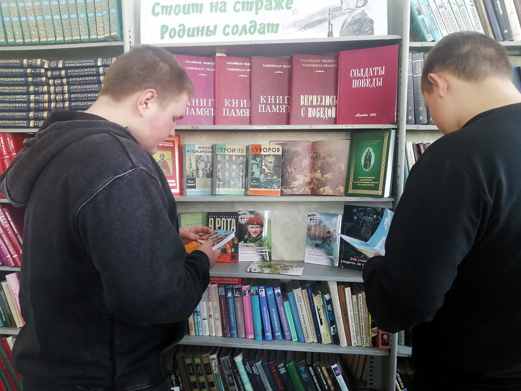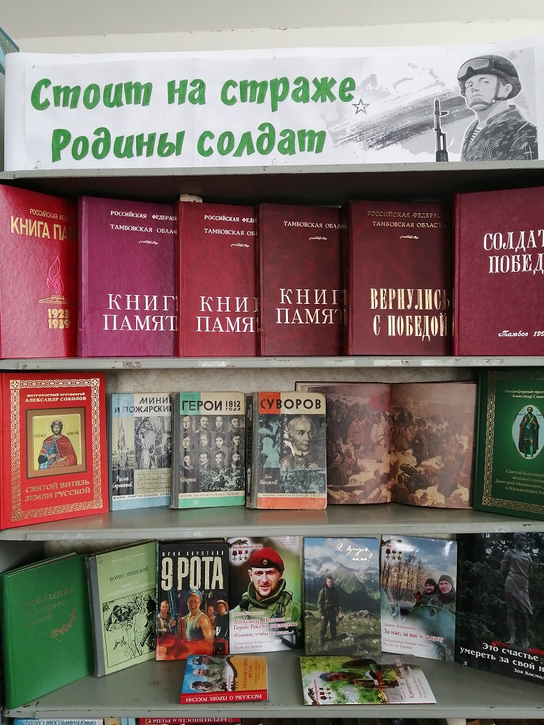 Среди множества праздников есть особый – 23 февраля, День защитника Отечества. В самом названии заложено благородное призвание и обязанность защищать Родину и свой народ. Солдатам Отечества, воинам России посвящается тематическая выставка «Стоит на страже Родины солдат». Посетители могут познакомиться с изданиями о подвигах защитников Отечества в разные периоды российской истории, а также с художественными произведениями. Рудовский сельский филиал поздравляет всех мужчин с наступающим праздником – Днём защитника Отечества! Желаем мирного неба, здоровья и всех благ!
