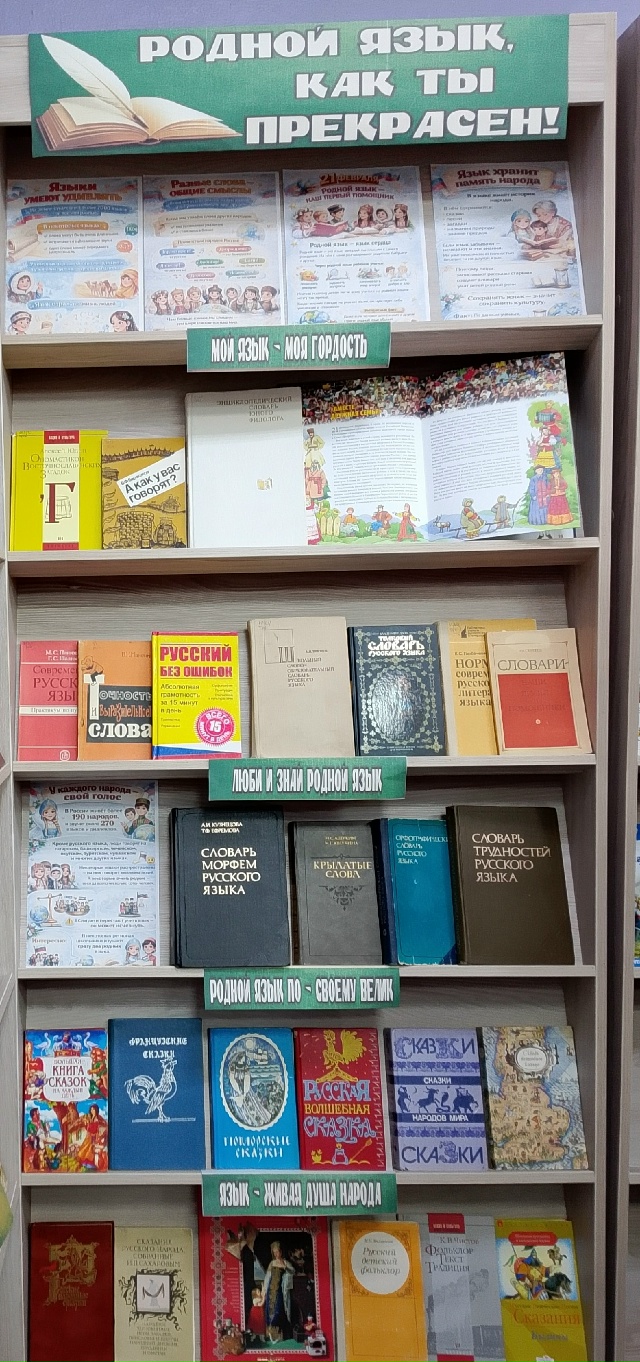 К мероприятию оформлена книжная выставка “Родной язык, как ты прекрасен”, на которой представлены различные словари, энциклопедии, посвящённые родному языку, литература по фольклору, книги с пословицами, поговорками, сказками.