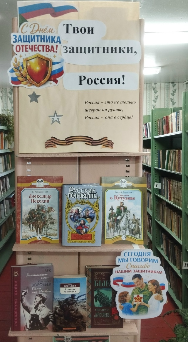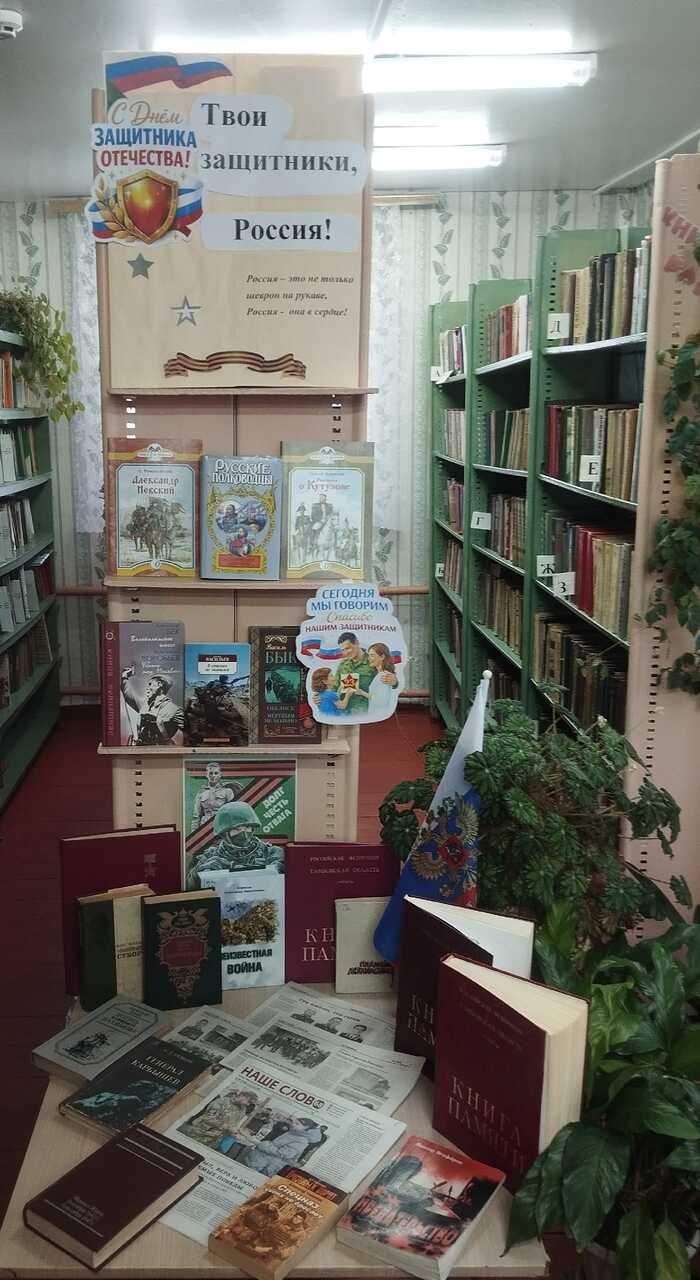В преддверии этого праздника на абонементе нашей библиотеке оформлена книжная выставка – дата: «Твои защитники, Россия!».