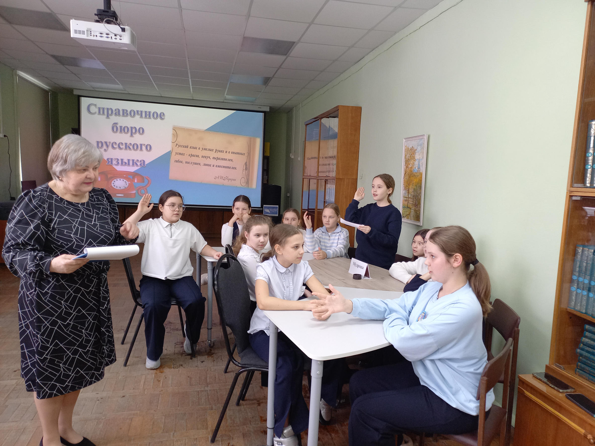 Юные лингвисты разделились на две команды — «Мыслители» и «Мудрецы» — и приняли участие в работе «Справочного бюро русского языка».