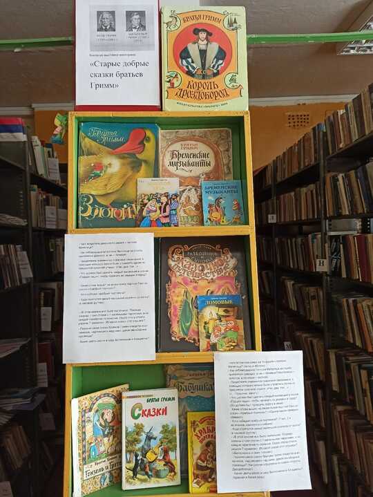 В Мановицком сельском филиале оформлена книжная выставка-викторина “Старые добрые сказки братьев Гримм”. На ней представлены вашему вниманию известные и любимые произведения братьев Гримм: “Бременские музыканты”, “Золотой гусь”, “Белоснежка”, “Король Дроздобород” и другие.