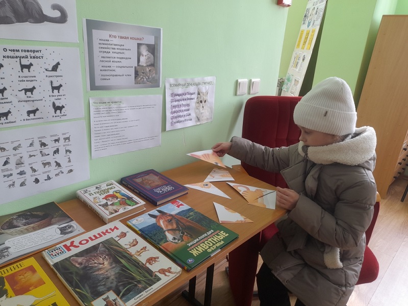 Посетители с удовольствием участвуют в викторине, отгадывают загадки и собирают пазлы, вспоминают приметы, связанные с кошками и рассказывают о своих домашних мурлыках.