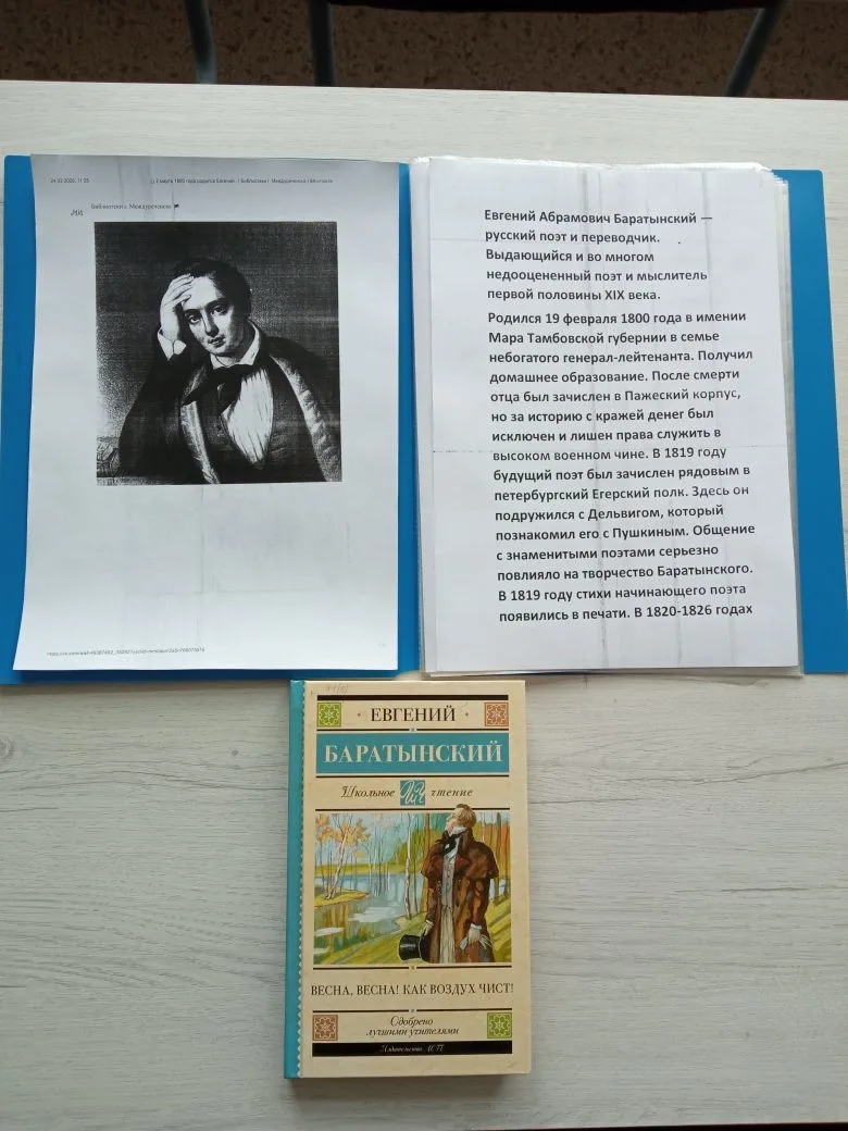 В рамках Всероссийской акции «Читаем Евгения Боратынского», проводимой ко дню рождения поэта с целью популяризации и продвижения творческого наследия Е.А.Боратынского в подростковой и молодёжной среде, в Калаисской сельской библиотеке МБУК «БКМО» прошёл литературно-поэтический час «Читаем Евгения Боратынского». На мероприятии присутствующие узнали о жизни и творчестве этого талантливого поэта и человека непростой судьбы, рассказали известное стихотворение поэта «Весна, весна! Как воздух чист!» и познакомились с другими произведениями пейзажной лирики поэта: «Осень», «Водопад», «Буря», «Звезда» и др.