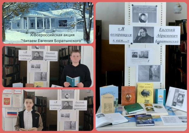 К мероприятию была оформлена книжная выставка – развал «Я возвращуся к вам…». Книги, представленные на выставке, знакомят с жизнью и творческим наследием поэта. Любителям поэзии особенно дорога память о Маре Кирсановского уезда Тамбовской губернии, усадьбе, где родился и жил замечательный русский поэт Евгений Абрамович Боратынский.