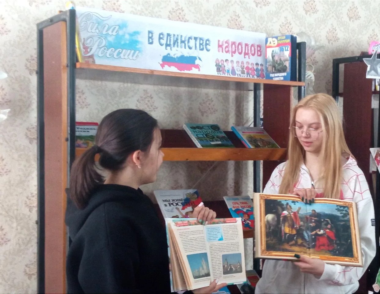 В детской библиотеке прошла презентация выставки «Сила России в единстве народов». Используя литературу с выставки Сукорцева Анастасия и Захарова Татьяна познакомили участников литературного кружка «Собеседник» с историей объединения народов многонационального Российского государства, с рукотворными чудесами, созданными талантом и трудом проживающих на её территории народов.